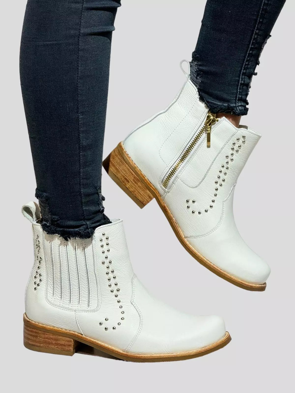 Precio regular $109.990Precio en oferta $109.990 Precio regularPrecio unitario / porUn botín urbano con detalles que marcan la diferencia. Confeccionado en cuero beige y decorado con delicadas tachas doradas, este modelo combina funcionalidad y estilo. Su...
