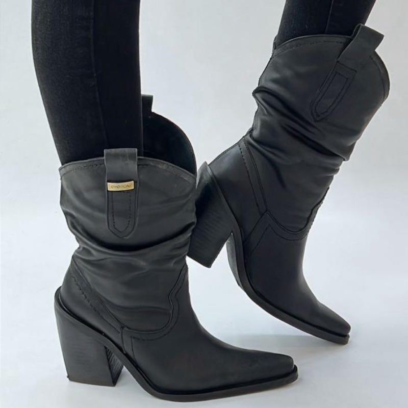 Precio regular $149.990Precio en oferta $149.990 Precio regularPrecio unitario / porElegante bota negra de cuero con taco chino de 10 cm y plataforma de 4 cm. Su punta semi-puntiaguda y estructura firme alargan visualmente la pierna....