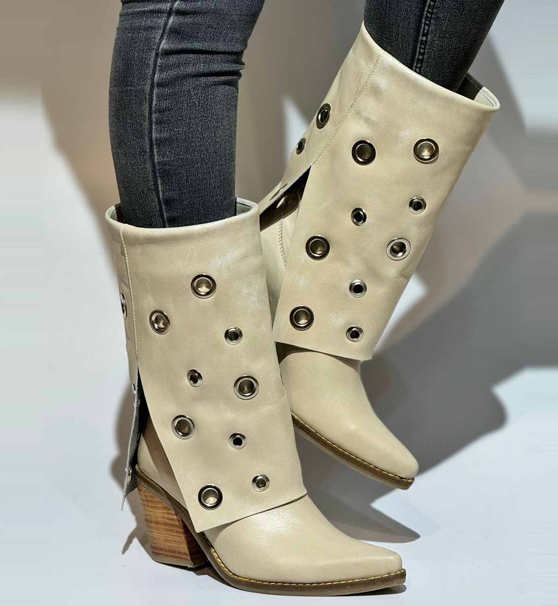 Precio regular $149.990Precio en oferta $149.990 Precio regularPrecio unitario / porBota nacional de cuero blanco y, moderna y elegante. Suela de madera, tacón de 8,5 cm y punta puntiaguda. Su contraste de colores ofrece un diseño...