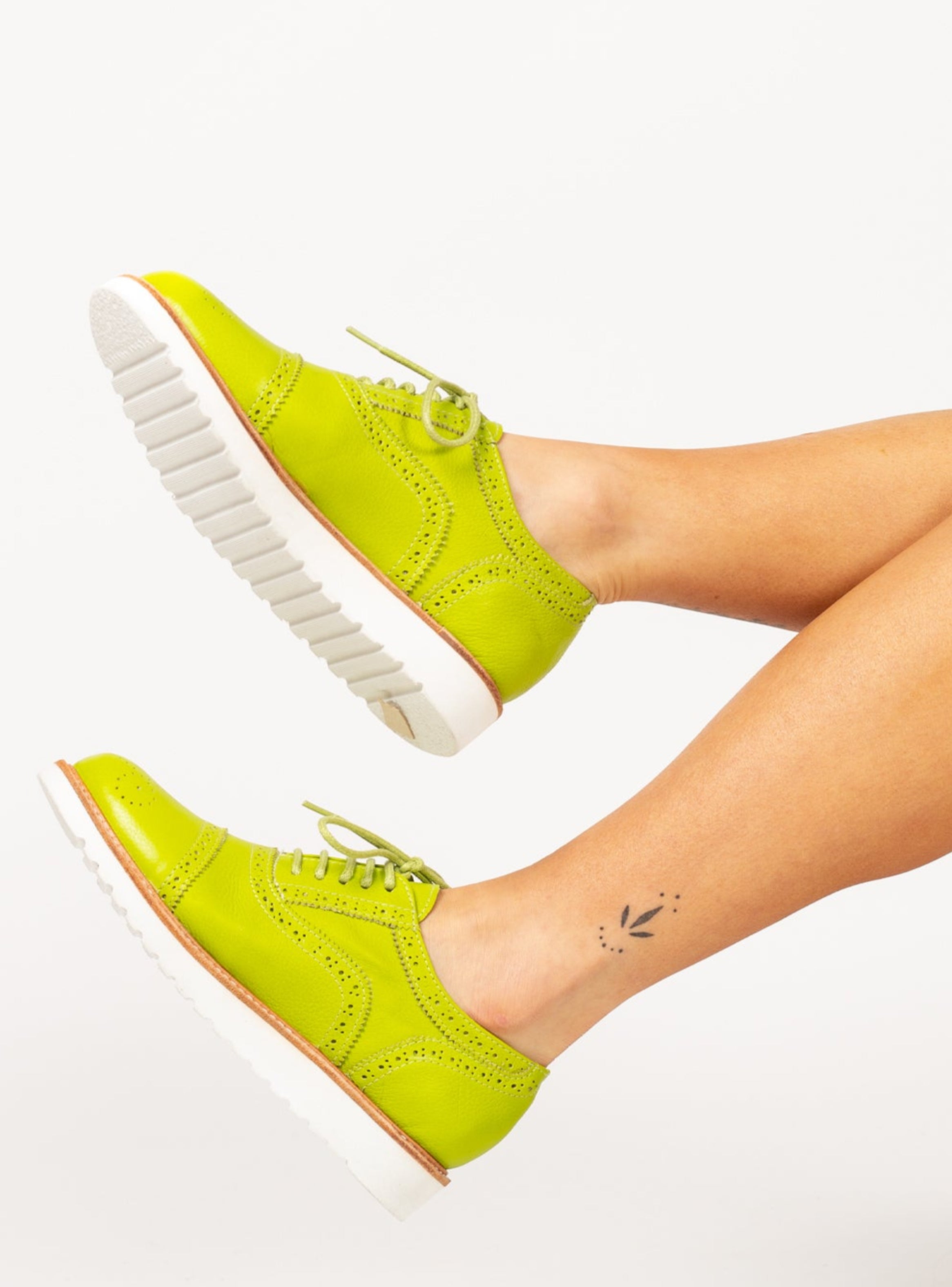 Zapatilla de cuero, alegre y original. Suela de goma, taco de 3 cm y plataforma de 4 cm. Punta redonda cómoda. Ideal para looks de primavera...