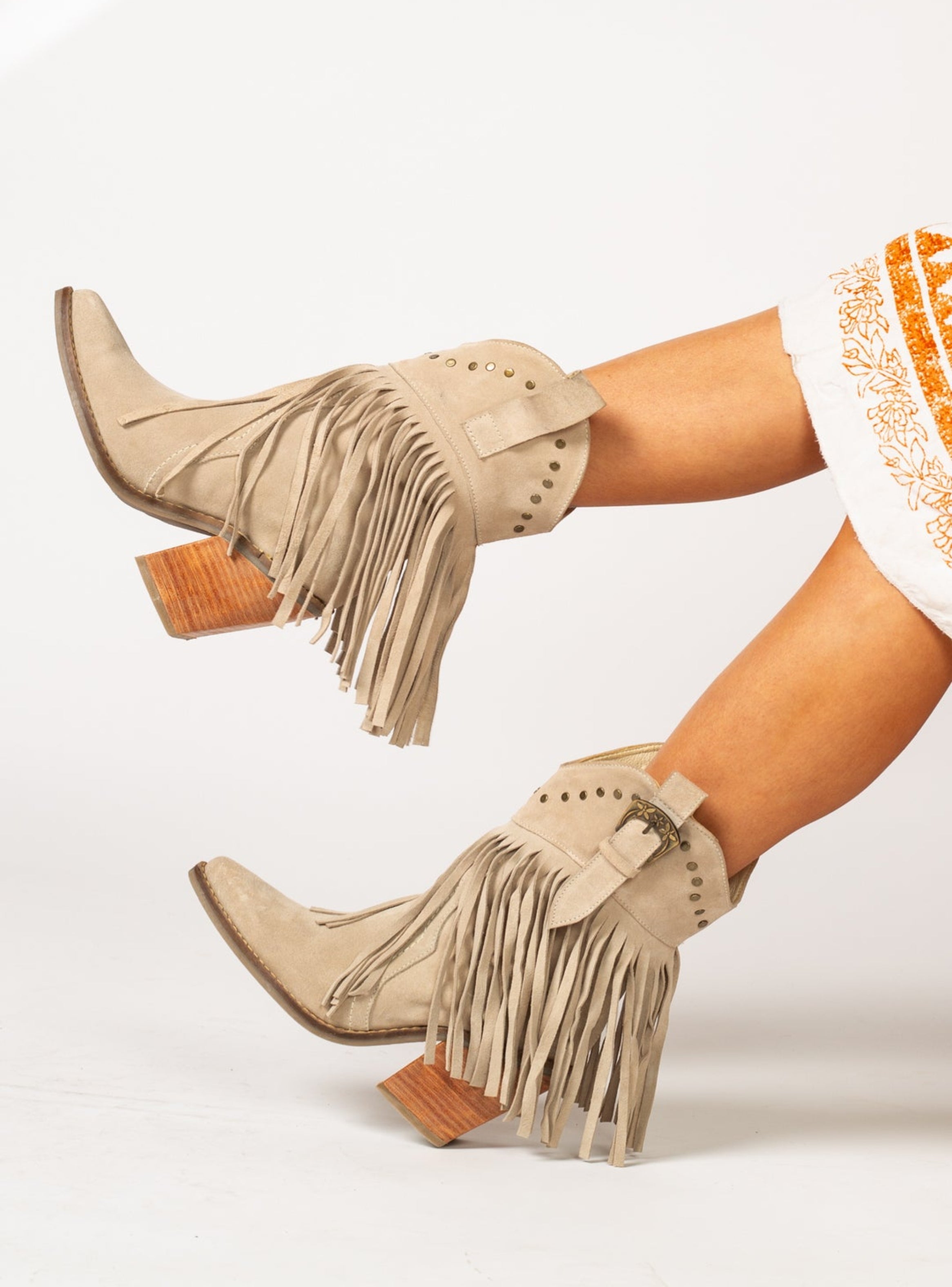 Estas botas estilo cowboy en tono arena son el complemento perfecto para un look auténtico y lleno de personalidad. Su diseño con flecos largos en gamuza...