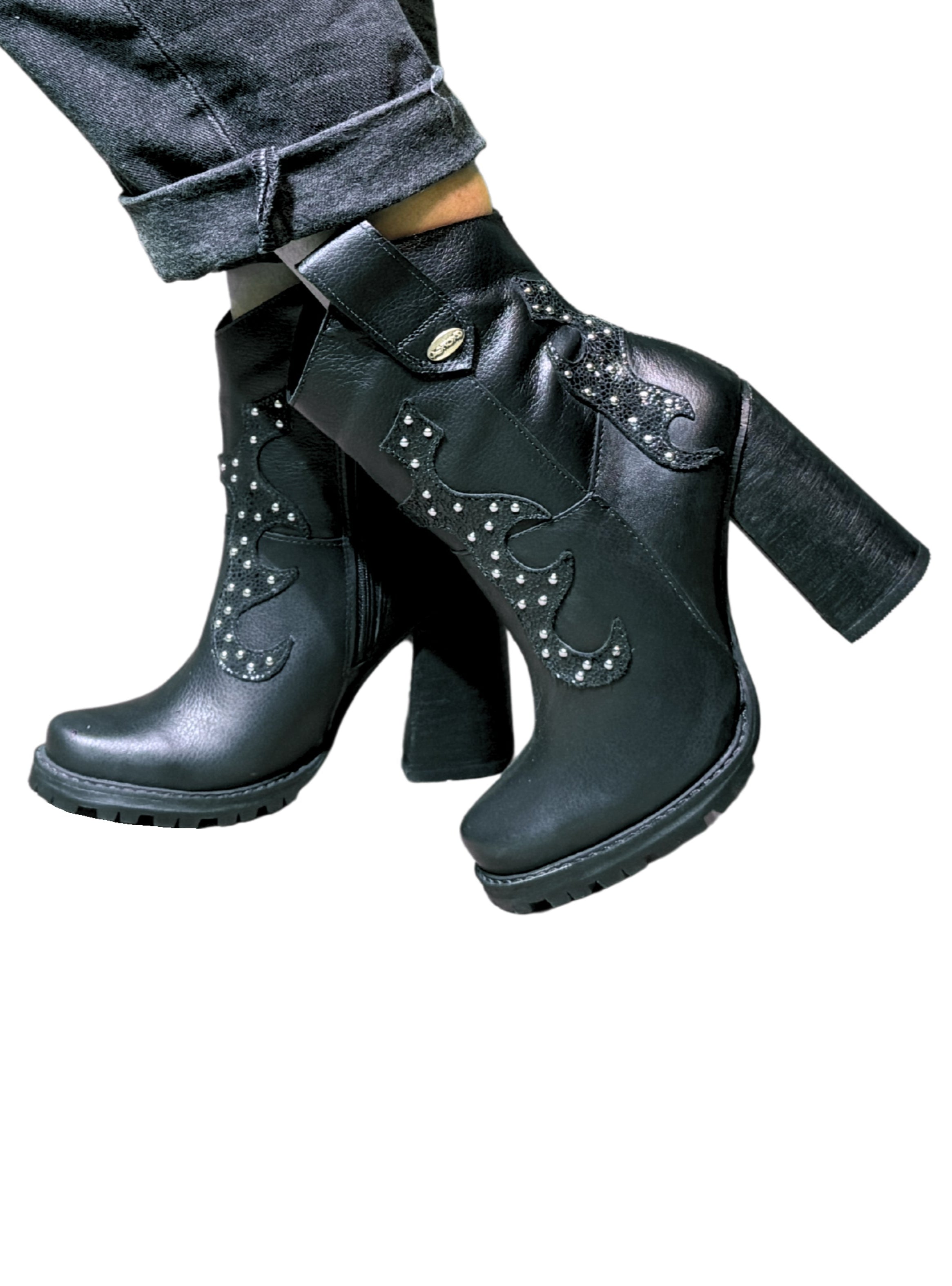 Una texana con personalidad única. Fabricada en cuero gamuzado negro, esta bota destaca por su detalle de flecos laterales y estrella dorada, aportando un toque divertido...