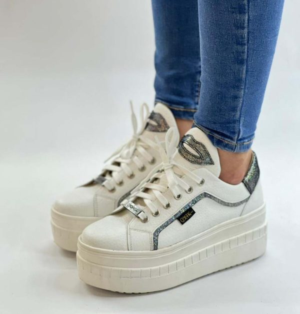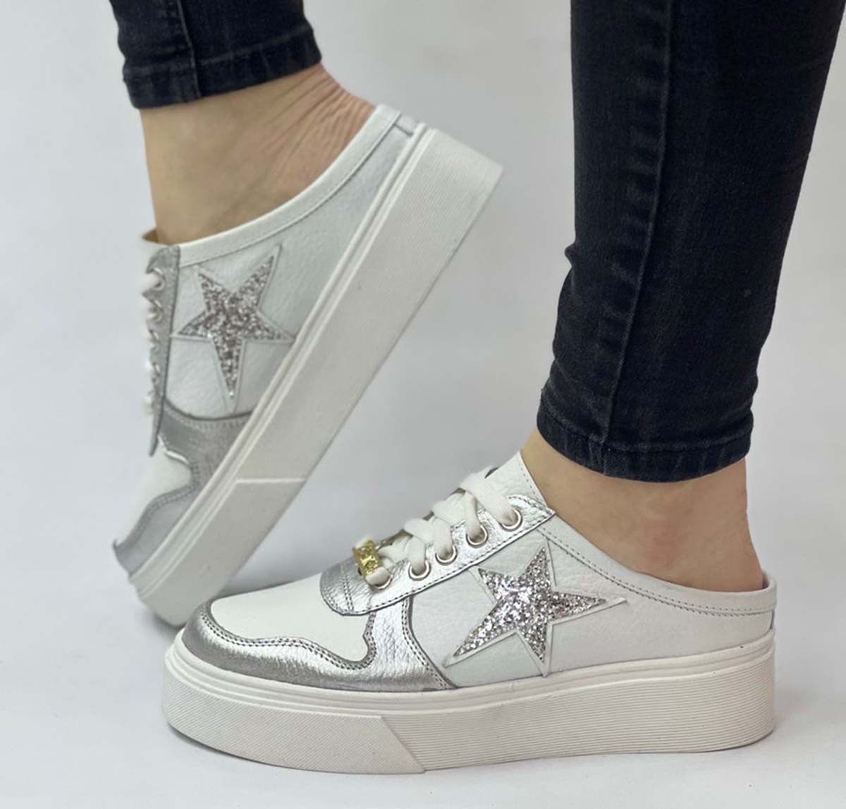 Precio regular $89.900Precio en oferta $89.900 Precio regularPrecio unitario / porZapatilla Malu nacional en cuero blanco con detalles de glitter plata. Punta redonda, suela de goma, taco de 4.5 cm y caña de 2 cm. Diseño...