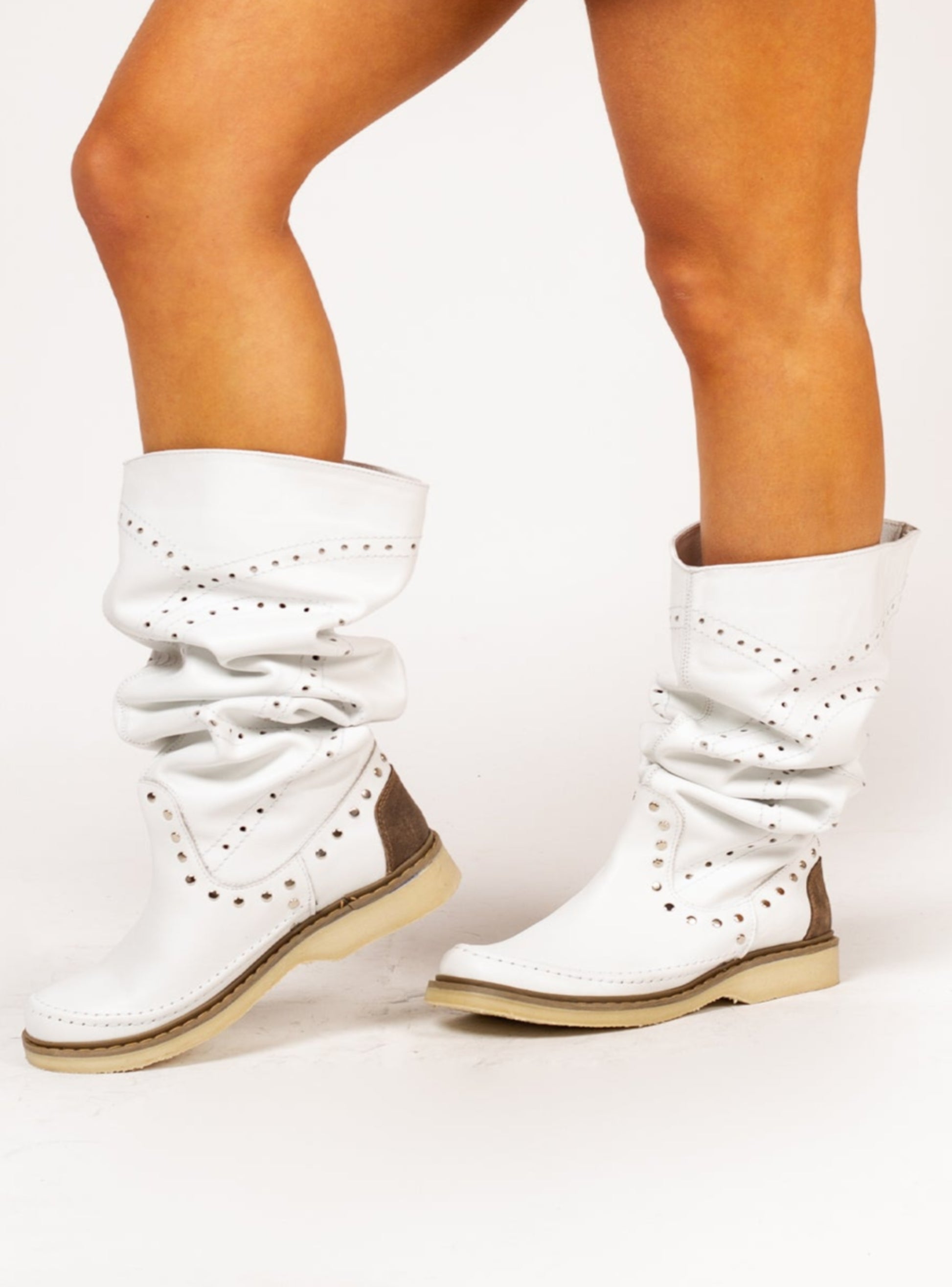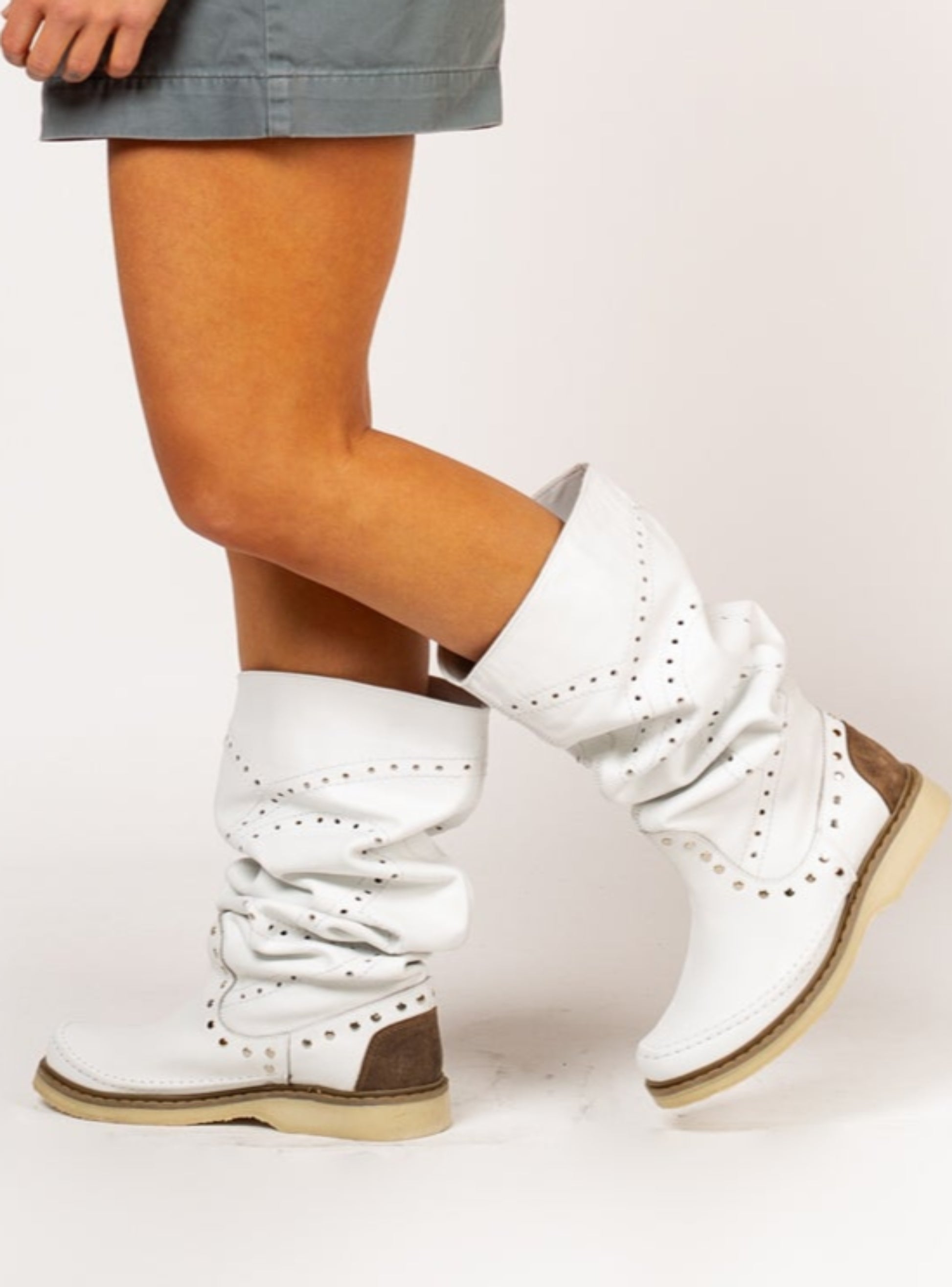 Estilo y comodidad en un solo diseño. La Bota Alex está confeccionada en suave cuero con detalles de perforado y aplicaciones en tono camel en el talón. Su caña alta y arrugada le da un toque relajado y versátil, perfecto para usar tanto con jeans como con faldas o vestidos. La suela ligera y flexible asegura comodidad durante todo el día. Un básico con personalidad para esta temporada. Colores disponibles: Blanco.