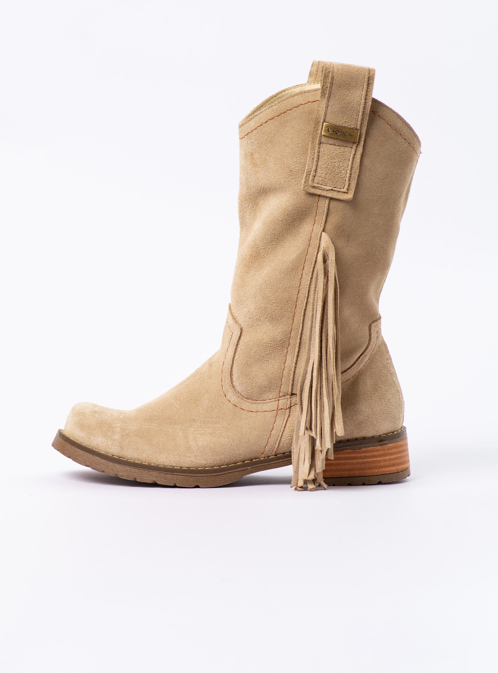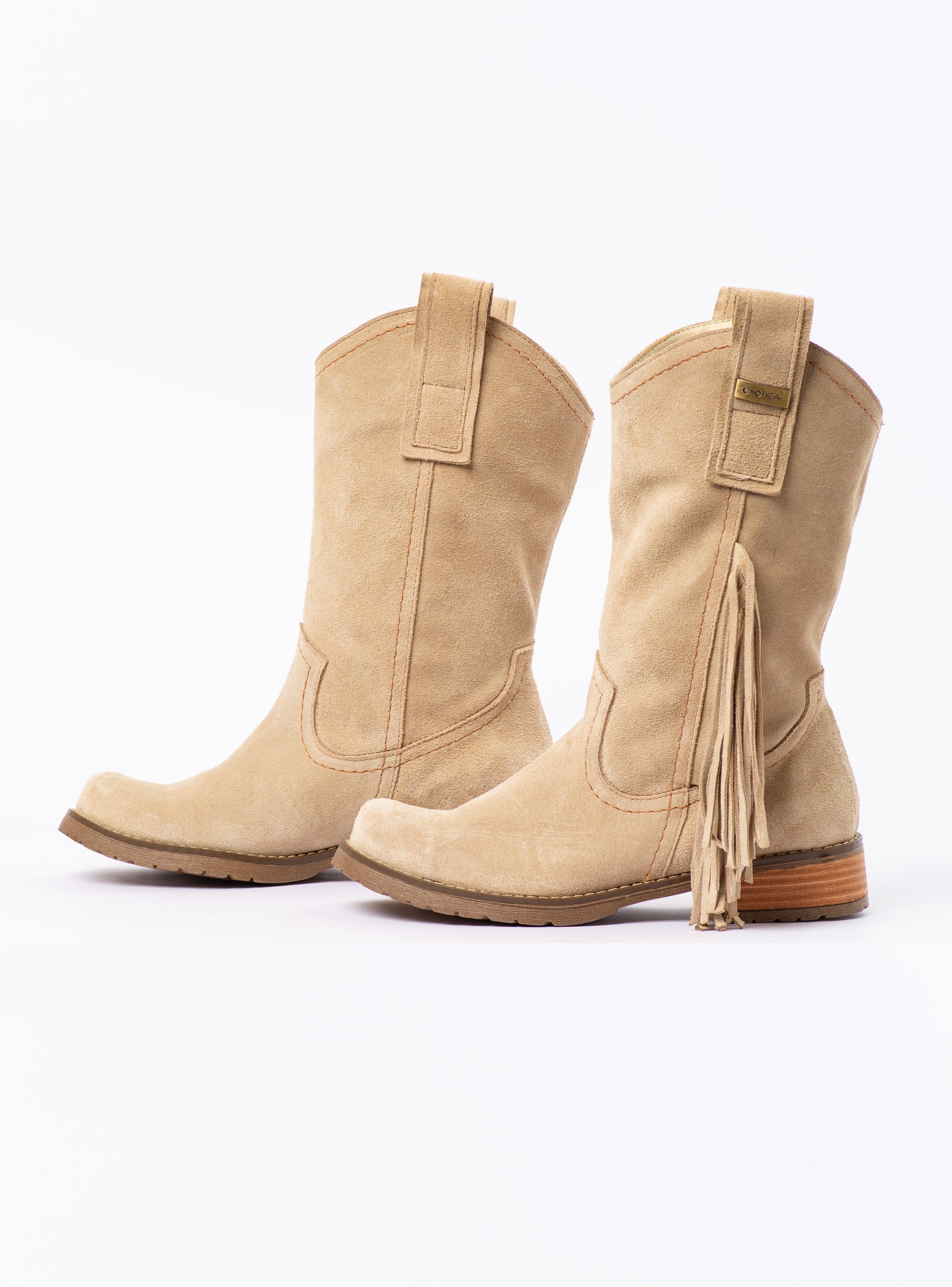 Diseñada en cuero gamuzado de primera categoría, esta bota estilo texano en tono arena es el complemento ideal para un look auténtico y versátil. Su diseño clásico se realza con detalles de flecos laterales que aportan movimiento y un aire bohemio, mientras que su suela resistente y tacón bajo de madera aseguran comodidad y durabilidad. Un calzado artesanal pensado para acompañarte en cualquier temporada con estilo y personalidad. Colores disponibles: Reno Arena.