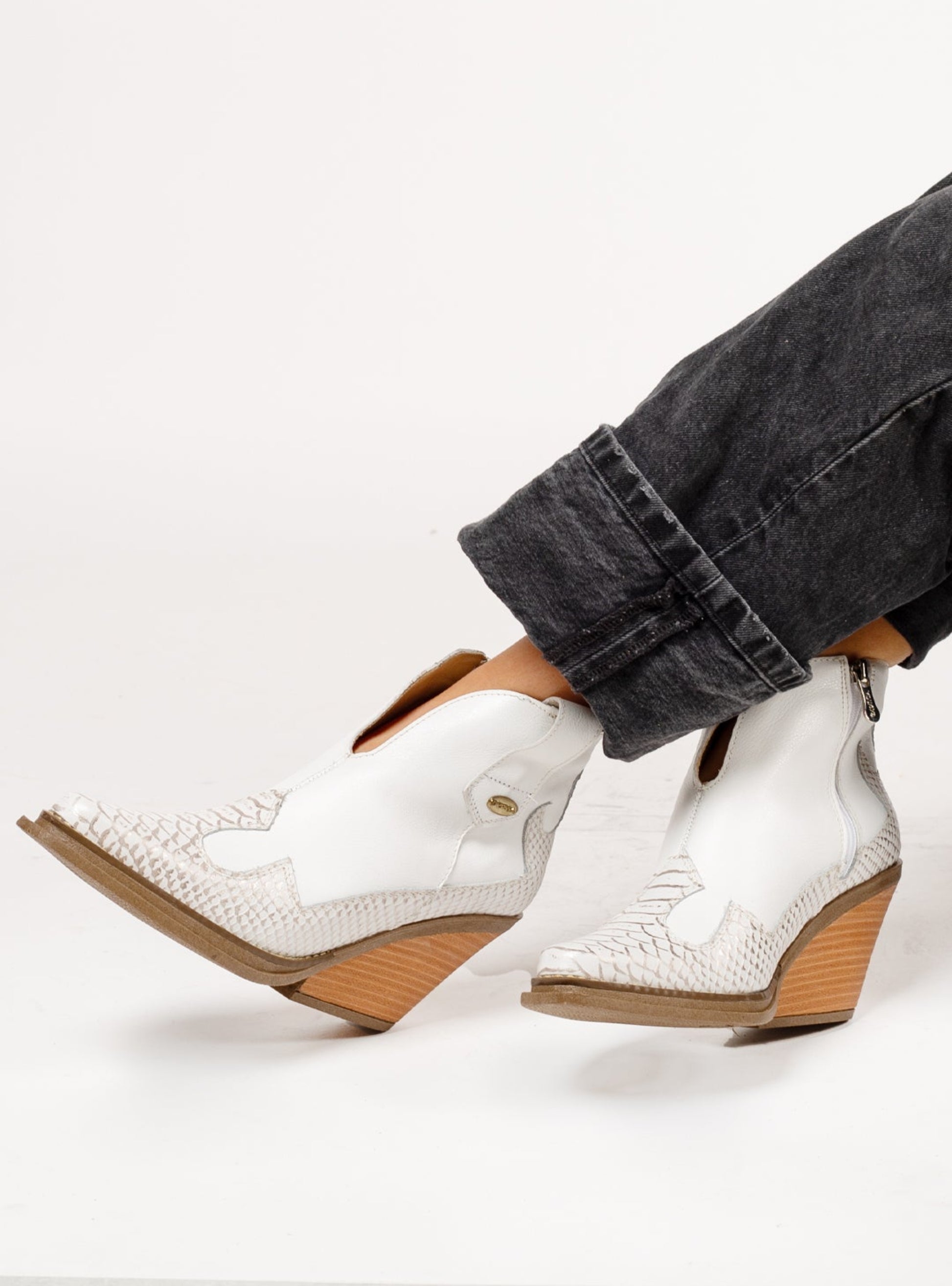 Los Botines Aida son la elección ideal para quienes buscan un calzado versátil con un estilo moderno y elegante. Confeccionadas en acabado liso combinado con textura tipo reptil, aportan un contraste atractivo y cómodo. Su diseño con cierre lateral facilita el calce, mientras que el tacón ancho de madera ofrece comodidad y estabilidad en cada paso. Perfectas para realzar cualquier look casual o urbano con un toque chic y actual. Colores disponibles: Blanco.