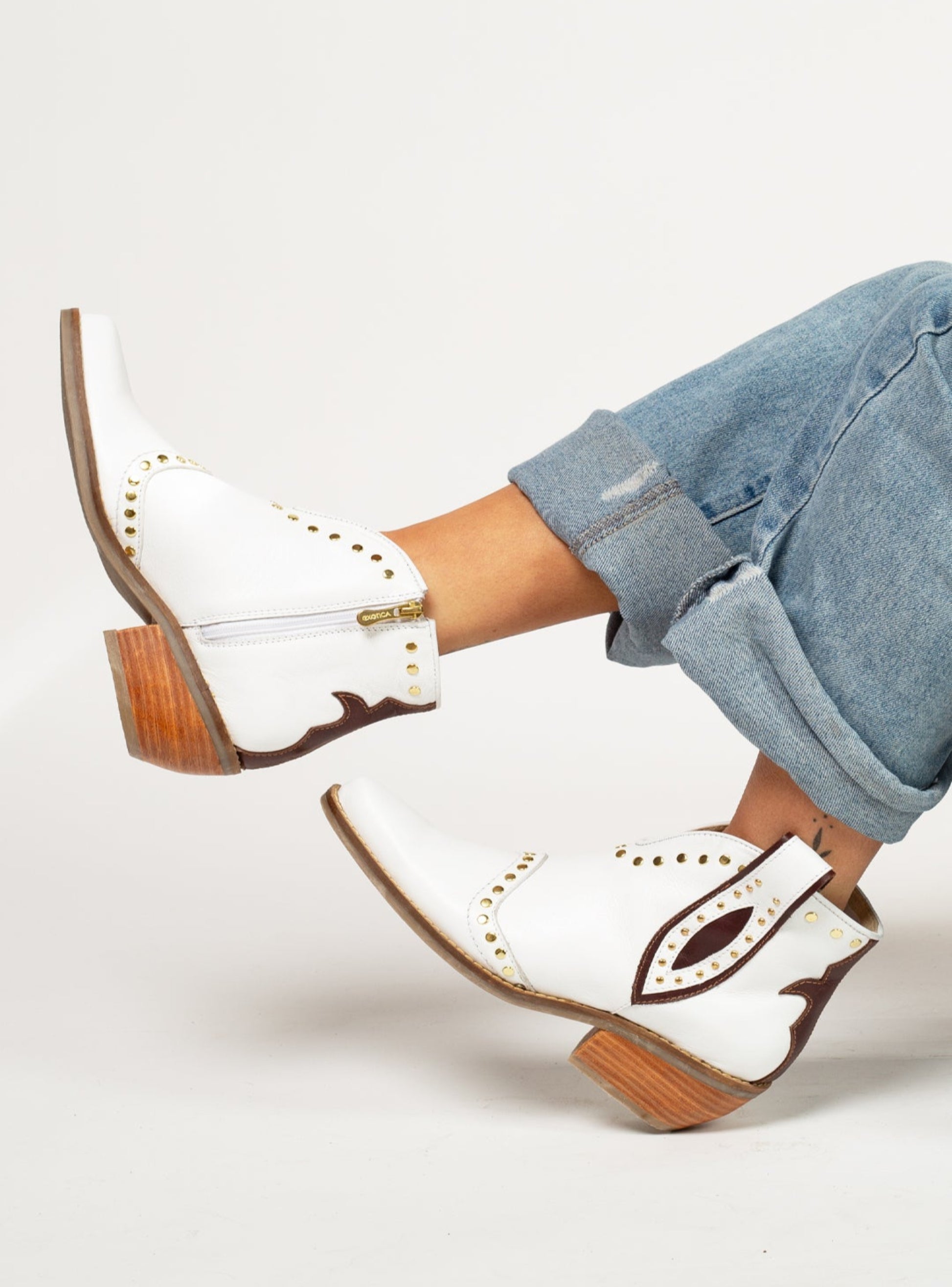 ¡Saca tu lado más atrevido con este botín western blanco! Con detalles en tachuelas doradas y cortes tipo vaquero, este diseño aporta personalidad y tendencia a cualquier outfit. Su tacón bajo y punta afilada hacen de este modelo una mezcla perfecta entre estilo y comodidad. ¡Imprescindibles en tu colección!. Colores disponibles: Blanco con café.