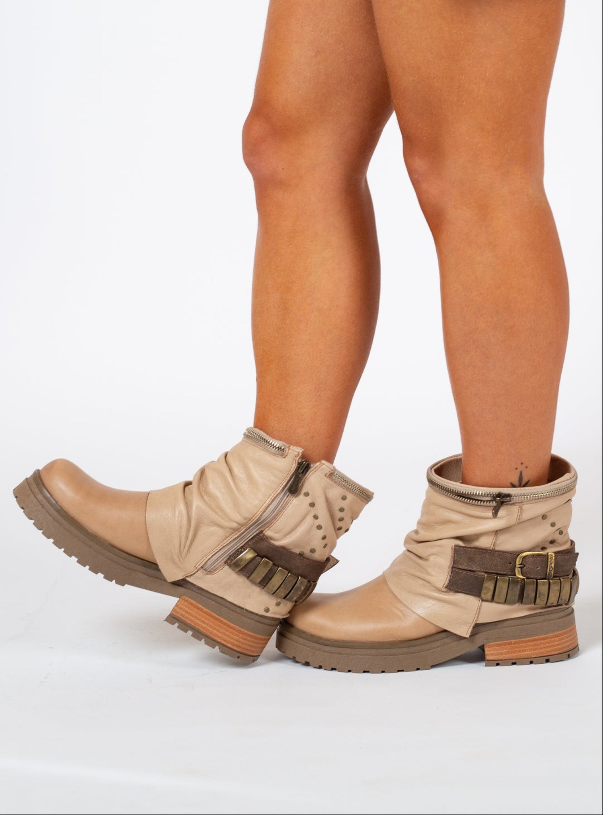 Confeccionadas en acabado tipo cuero suave y detalle de pliegues, cuentan con apliques metálicos y una correa marrón con hebilla que aporta un toque rústico y único. Su suela gruesa con tacón ligero de madera garantiza resistencia y confort en cada paso, convirtiéndolas en el complemento ideal para outfits casuales, urbanos o con inspiración occidental. Unas botas que no solo completan tu look, sino que lo elevan con personalidad. Colores disponibles: Beige.