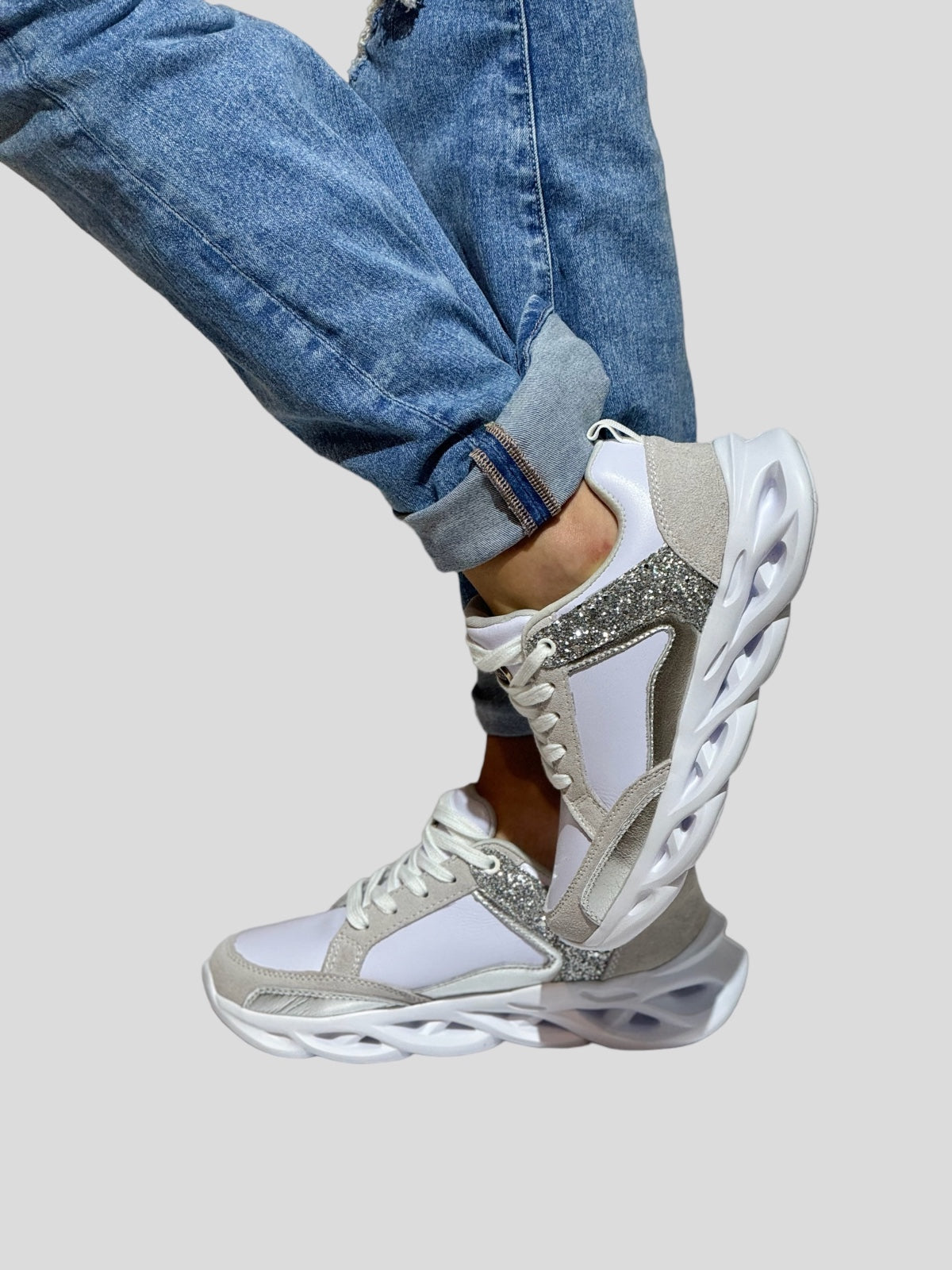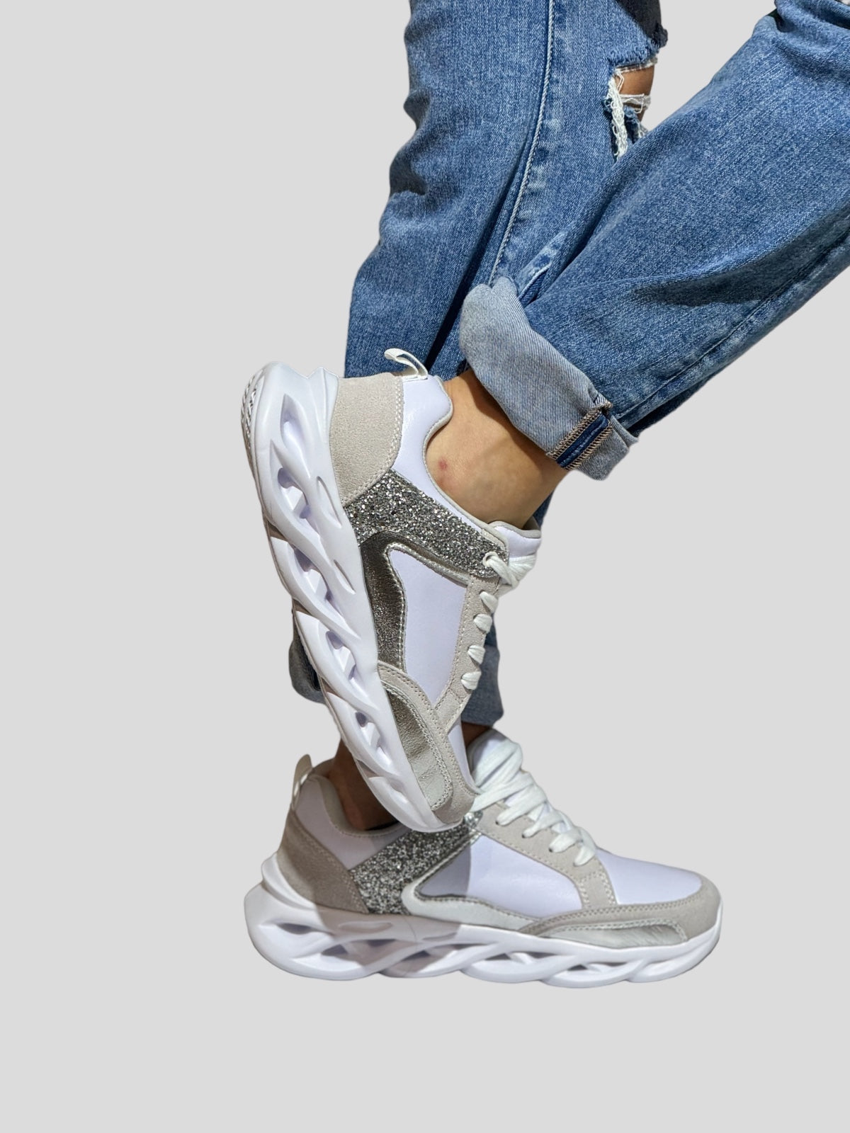 La Zapatilla Estela destaca por su elegancia y comodidad. Confeccionada en cuero y suela de goma, su tacón de 5 cm y punta redonda la hacen ideal para el día a día, aportando un toque brillante y cómodo con su acabado en plata. Colores disponibles: Blanco Plata.
