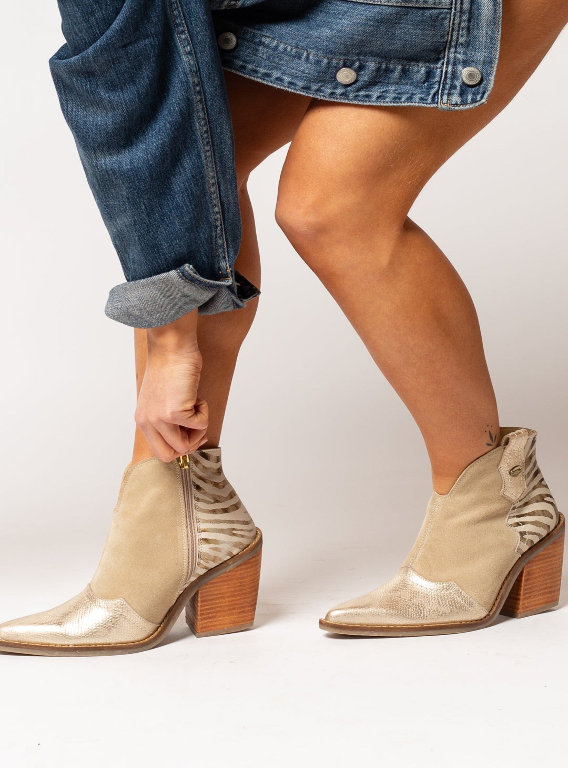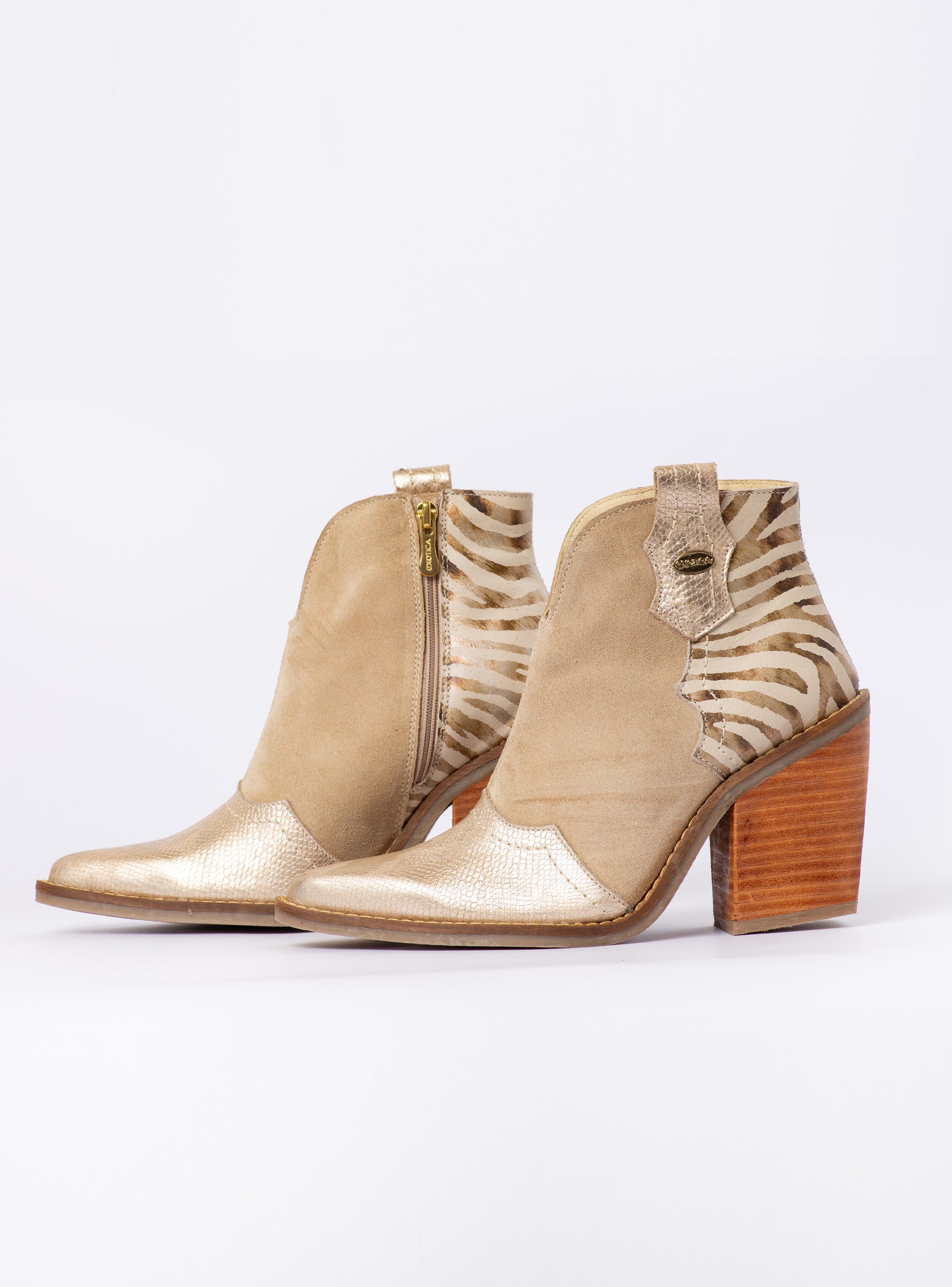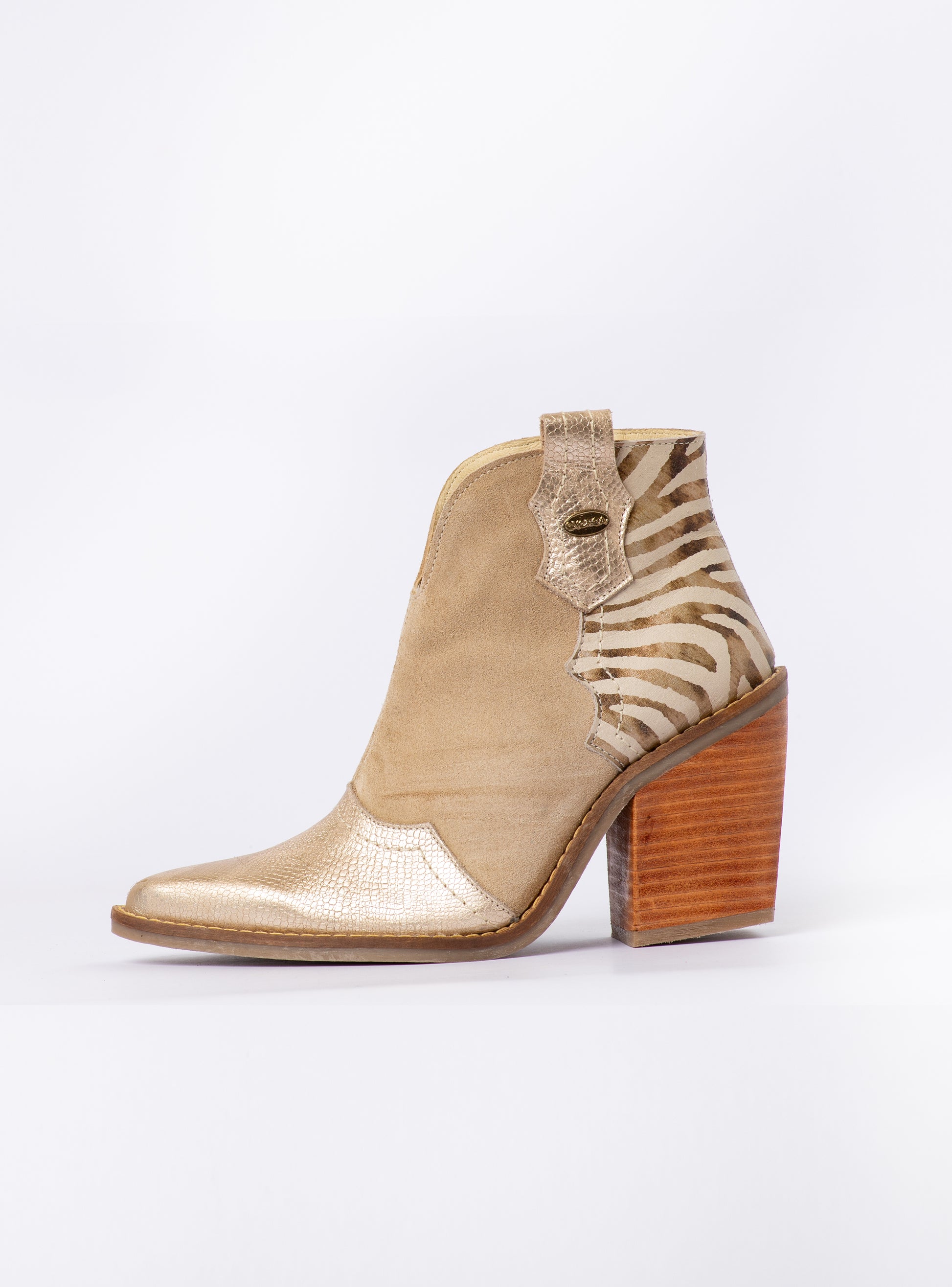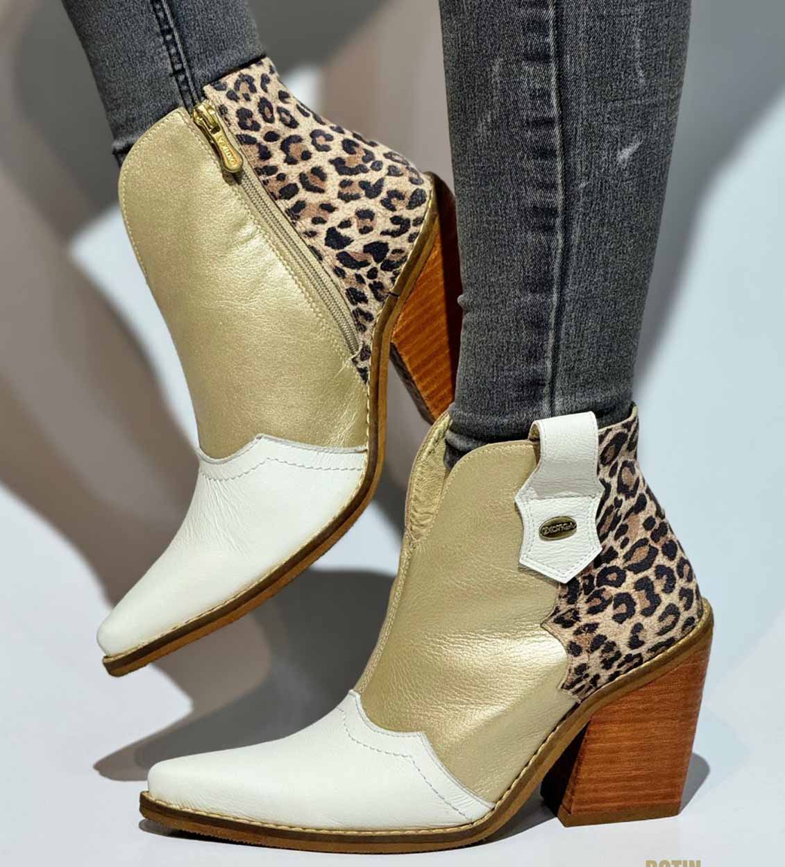 Botín Mady en cuero nacional, femenino y glamoroso. Punta puntiaguda, suela de madera, taco de 9 cm y caña de 10 cm. Ideal para darle un toque luminoso y elegante a cualquier outfit. Diseño cómodo y moderno que destaca en eventos especiales o salidas casuales. Colores disponibles: Cascabel Arena Cebra Dorado, Blanco Dorado Print, Dorado Vison Cebra Negro.