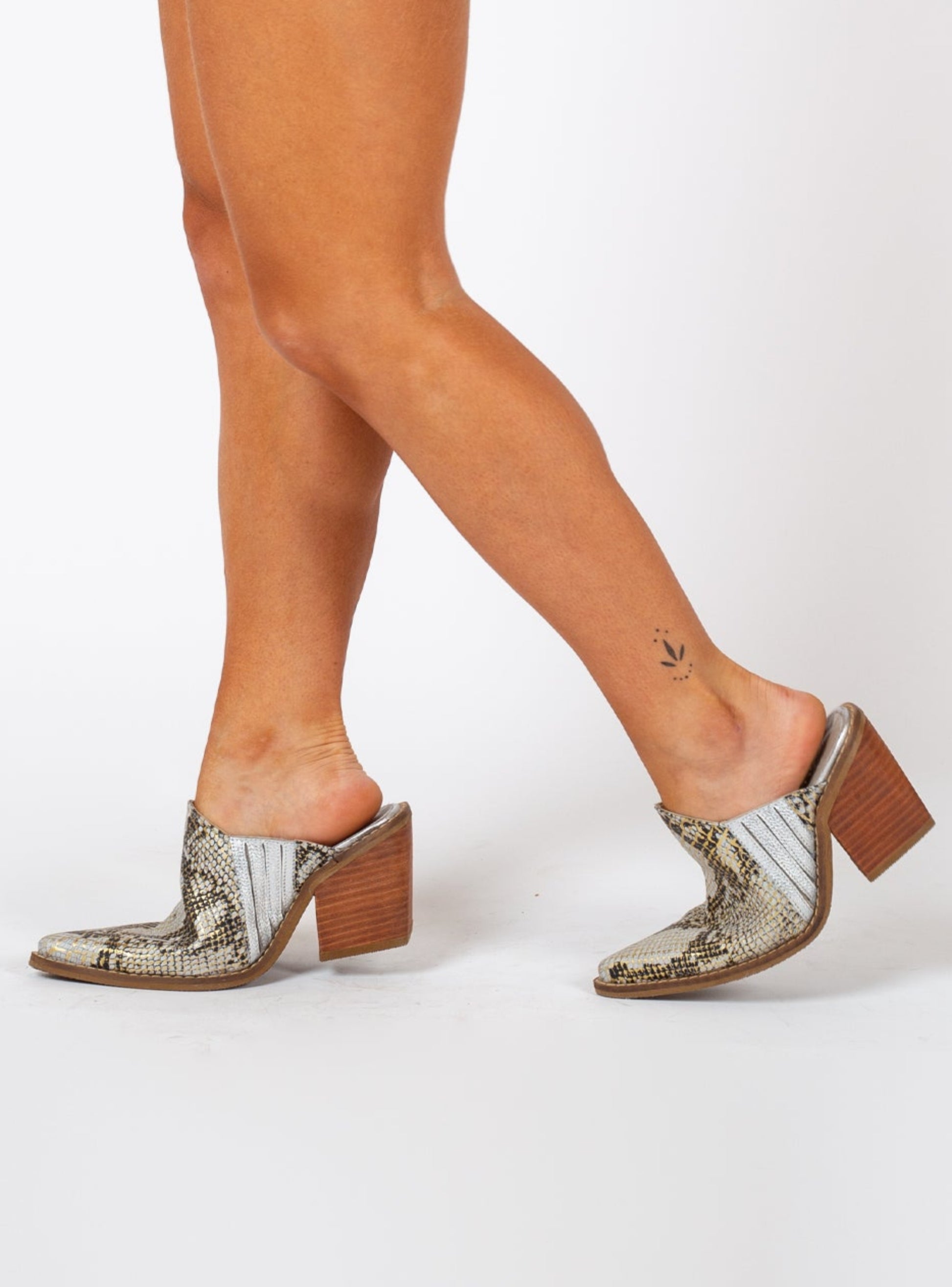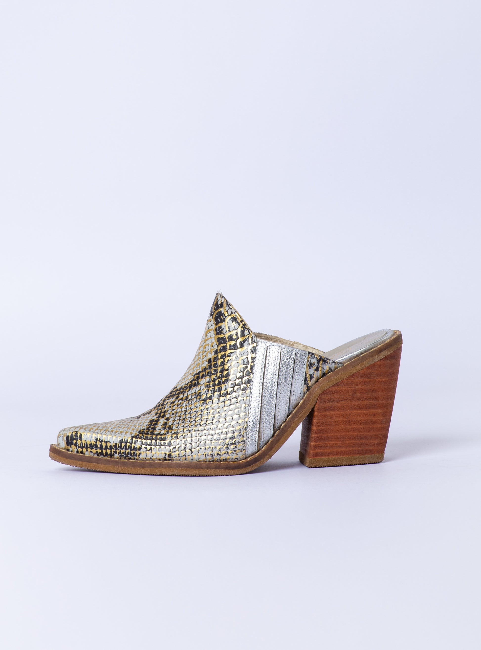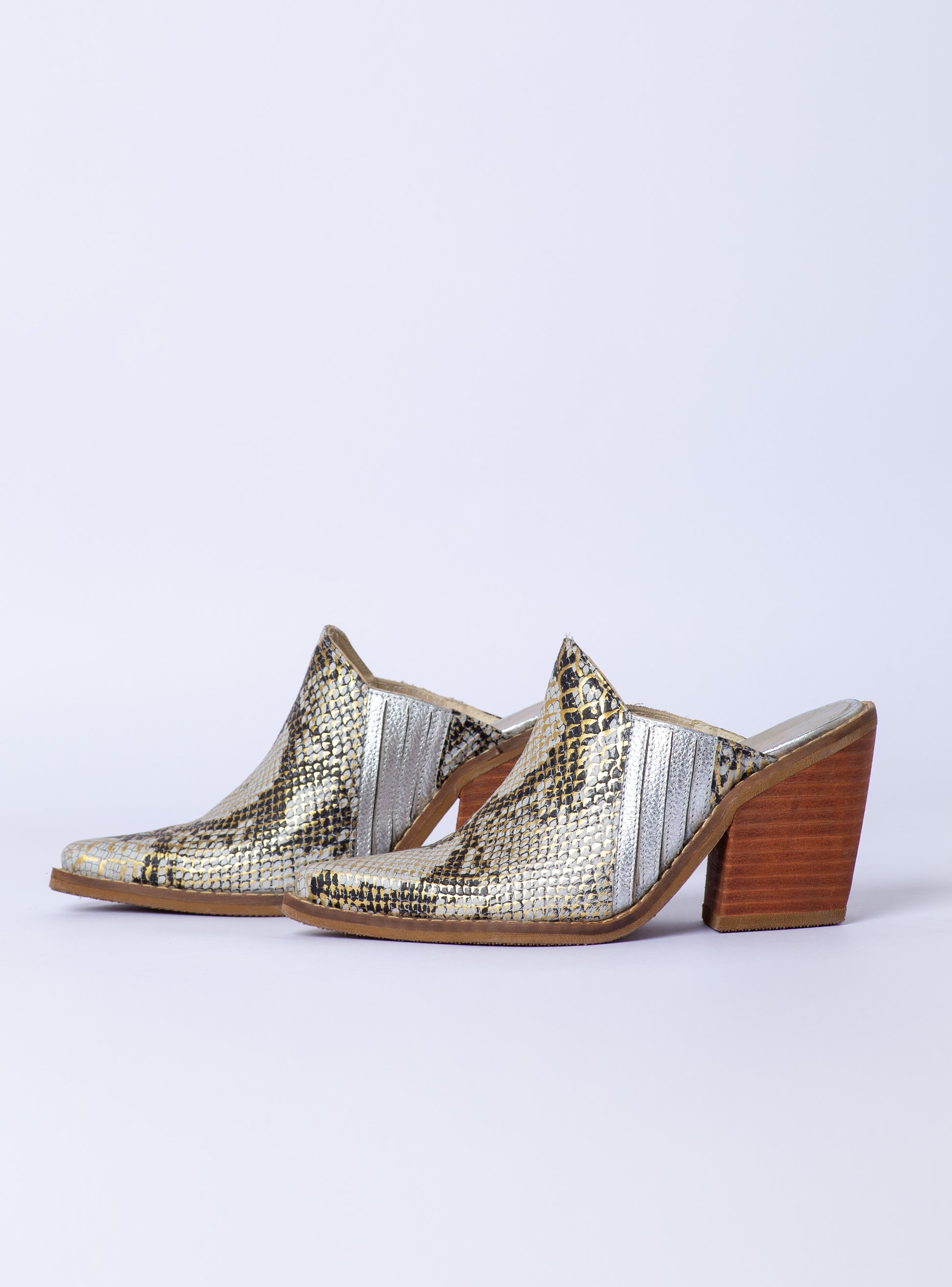 Esta puntilla con estampado víbora en tonos celeste y plata son pura personalidad y estilo. Su diseño destalonado con punta afilada aporta un aire cómodo, mientras que los laterales en acabado metálico plateado añaden un contraste moderno y llamativo. El tacón ancho de madera les da estabilidad y comodidad, siendo ideales para un look urbano atrevido con toques elegantes. Colores disponibles: Vibora Celeste con Plata.