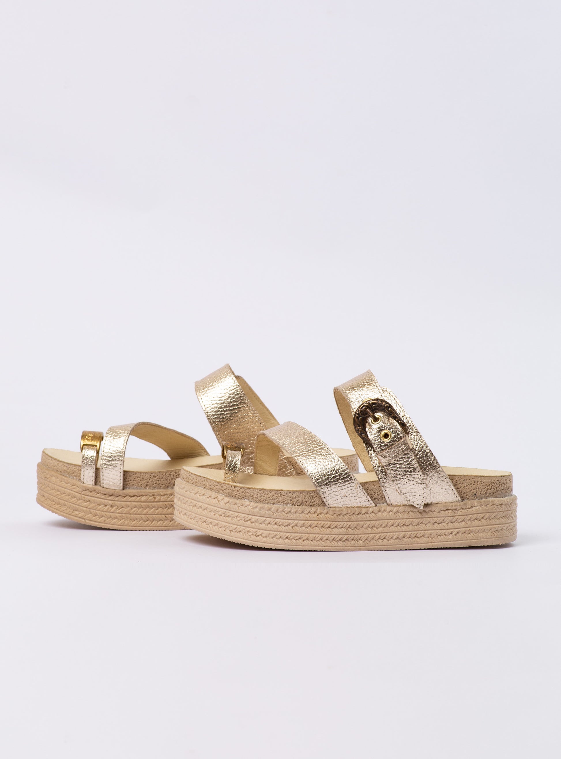 Las sandalias Fanny combinan estilo y comodidad con su diseño moderno y versátil. Fabricadas en material metálico dorado, destacan por sus tiras anchas con hebilla decorativa y su suela tipo plataforma forrada en yute que aporta un aire natural y fresco. Perfectas para el día a día, brindan comodidad sin perder elegancia. Un calzado ideal para complementar looks veraniegos y relajados con un toque cómodo. Colores disponibles: Dorado.
