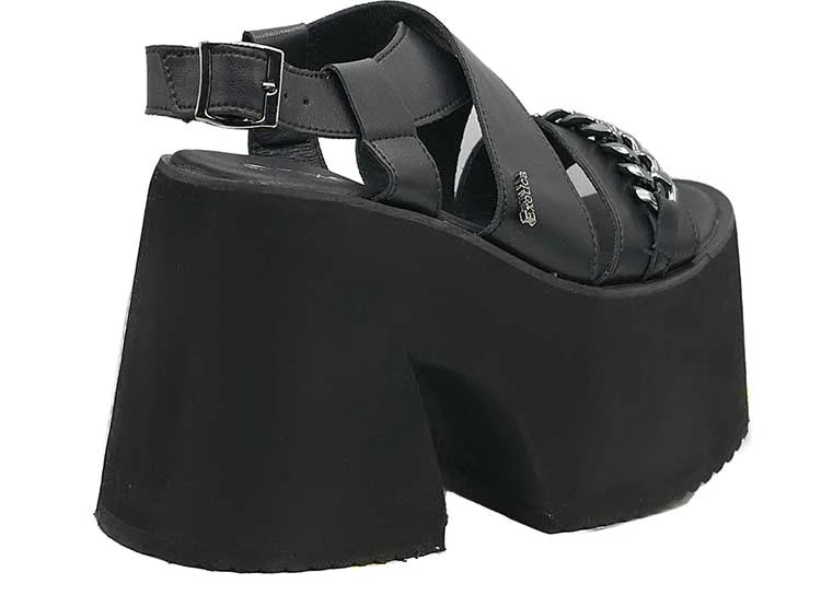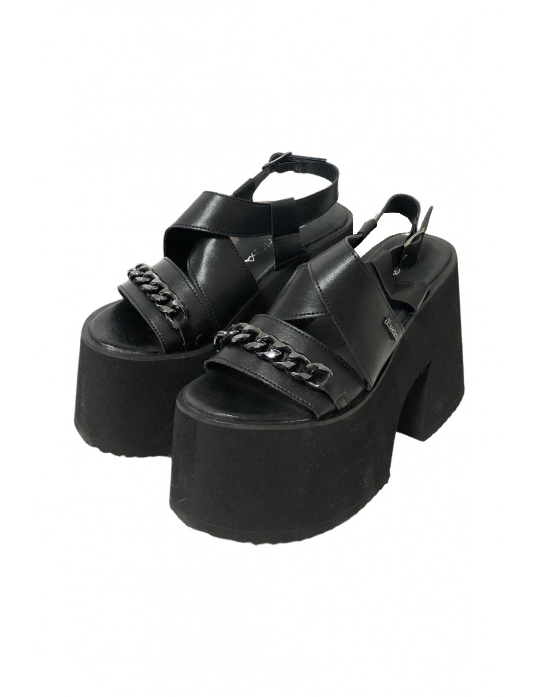La sandalia Italia combina un estilo audaz con comodidad. Confeccionada en cuero negro, destaca por su imponente plataforma y taco cuadrado que estilizan sin perder estabilidad. Su diseño cruzado incluye detalle de cadena metálica, aportando un aire moderno y atrevido. Ideal para quienes buscan un look urbano con personalidad y fuerza. Colores disponibles: Negro