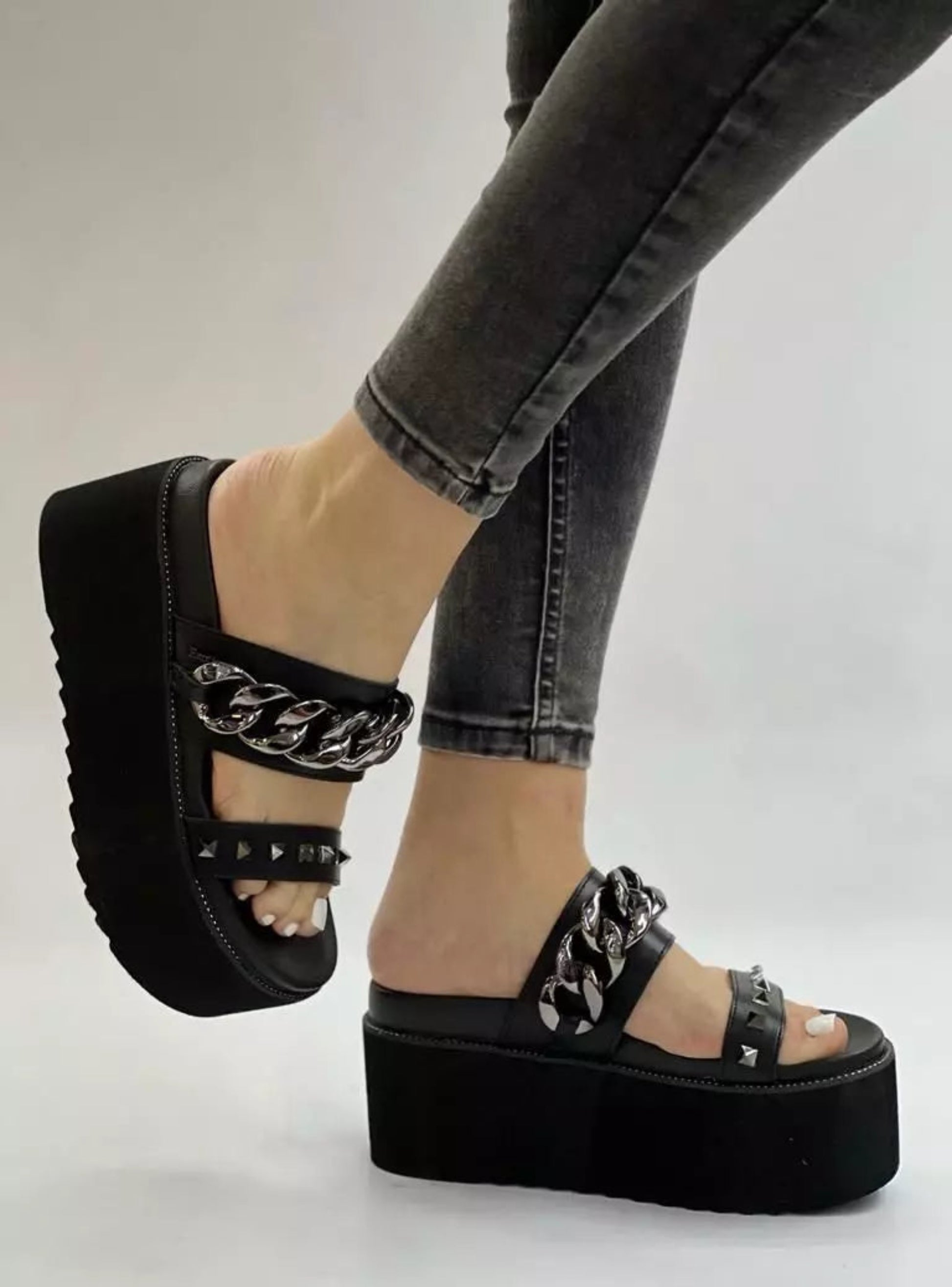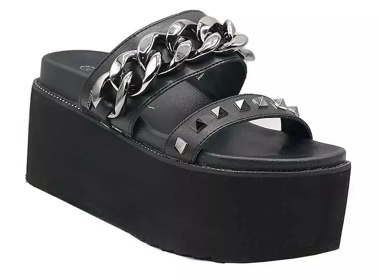 La sandalia Rita impone estilo con su plataforma robusta y ultra cómoda. Su diseño resalta con cadenas metálicas gruesas y aplicaciones de tachas que aportan un aire rebelde y moderno. Perfecta para looks urbanos con carácter, combina actitud, tendencia y comodidad, elevando cualquier outfit de día o de noche.