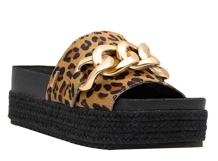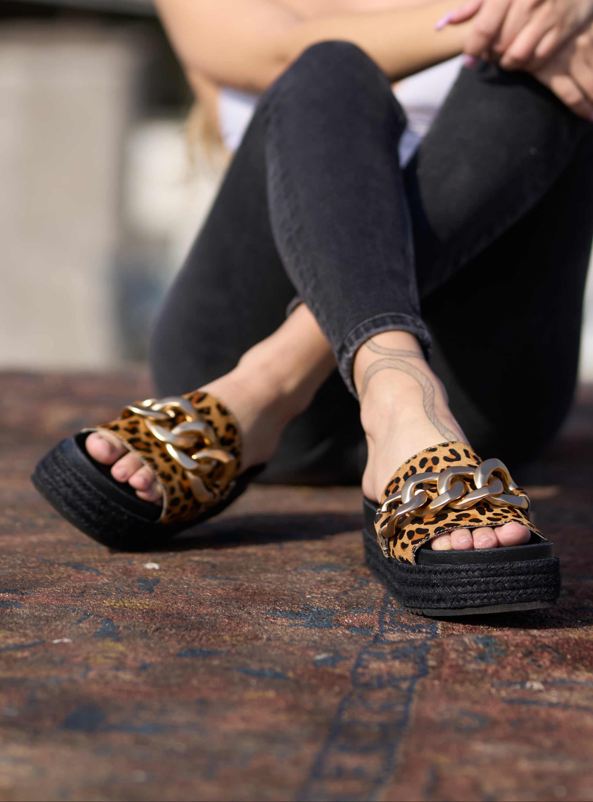 La Sandalia Toly con cadena es la mezcla perfecta entre comodidad y estilo urbano. Con plataforma ligera que entrega altura sin perder comodidad, destaca por su detalle de cadena XL en el empine, que le da un toque moderno y atrevido. Disponible en estampado de leopardo y en negro clásico , es el complemento ideal para elevar tus looks casuales con un aire trendy y versátil. Colores disponibles: Leopardo Print y Negro.