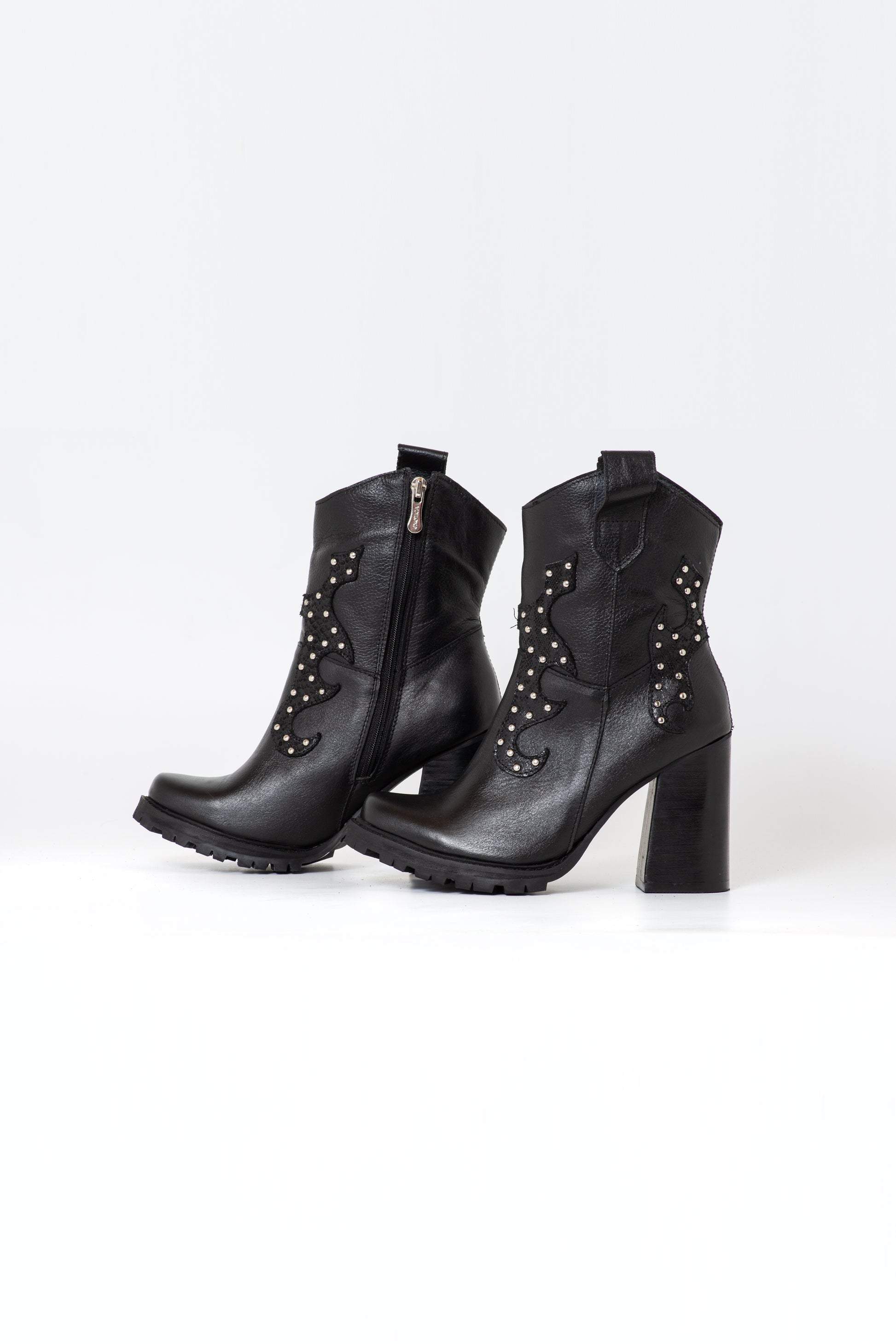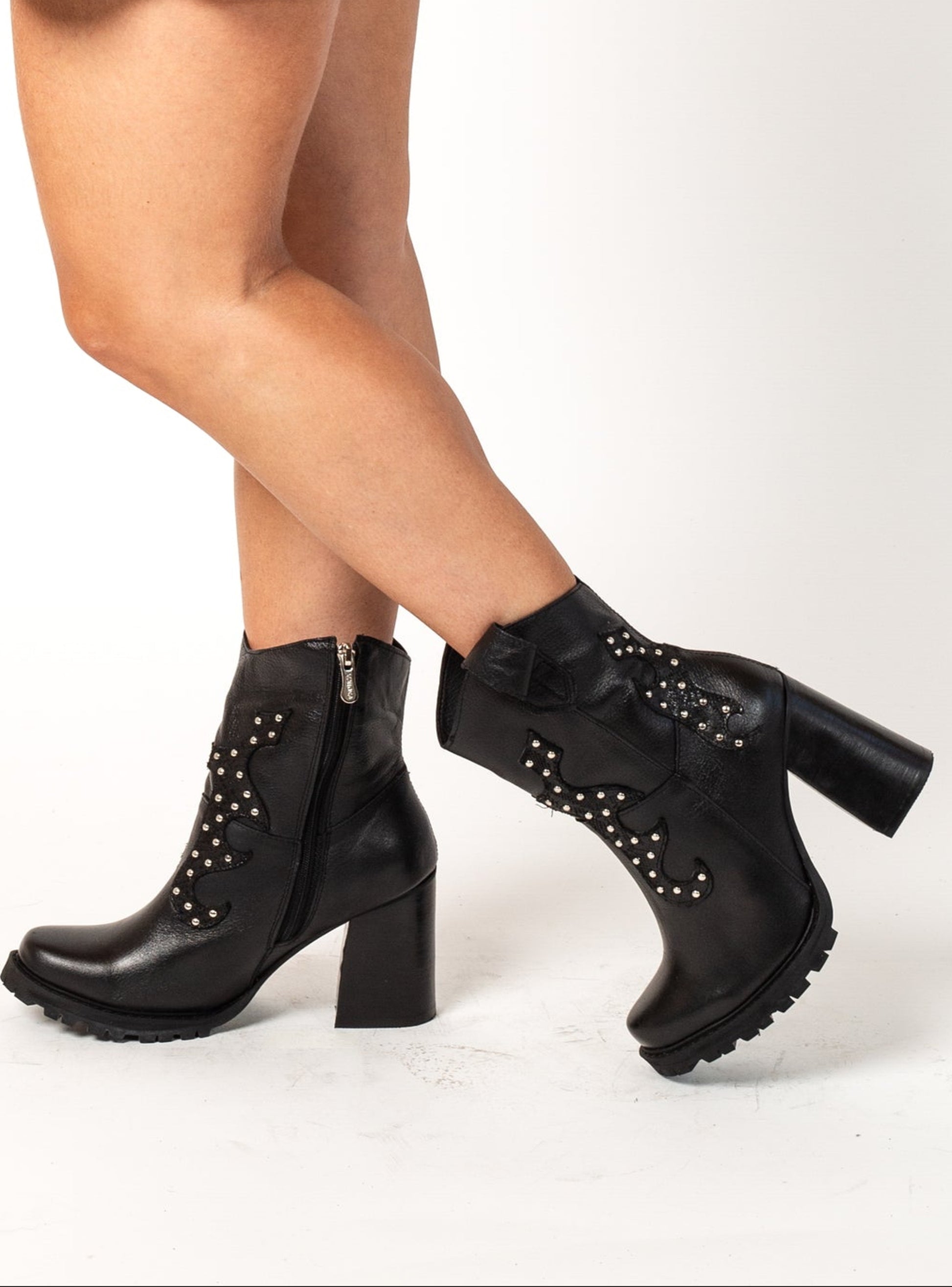 Botín de cuero, con suela de goma robusta. Taco de 10,5 cm y plataforma de 3,5 cm. Punta redonda. Un diseño poderoso que otorga altura y firmeza. Ideal para quienes buscan impactar y caminar con total seguridad sin sacrificar estilo ni comodidad. Colores disponibles: Negro, Celeste.