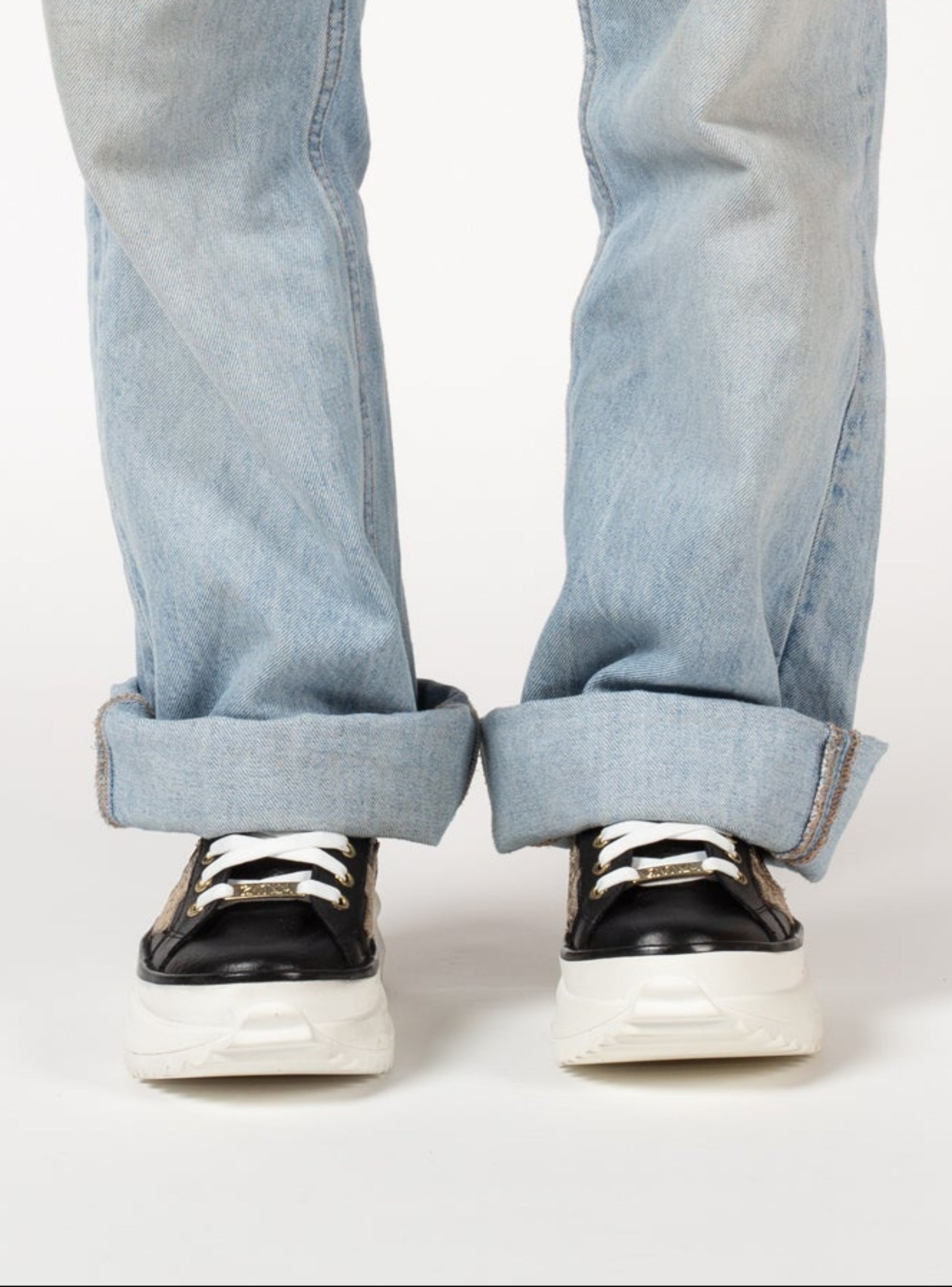 Zapatilla de cuero. Suela de goma, altura de 6 cm. Punta redonda. Un modelo cómodo y vibrante para looks urbanos con un toque de brillo y frescura. Colores disponibles: Negro/Dorado y Blanco/Negro Glitter, Blanco/Plata Glitter.