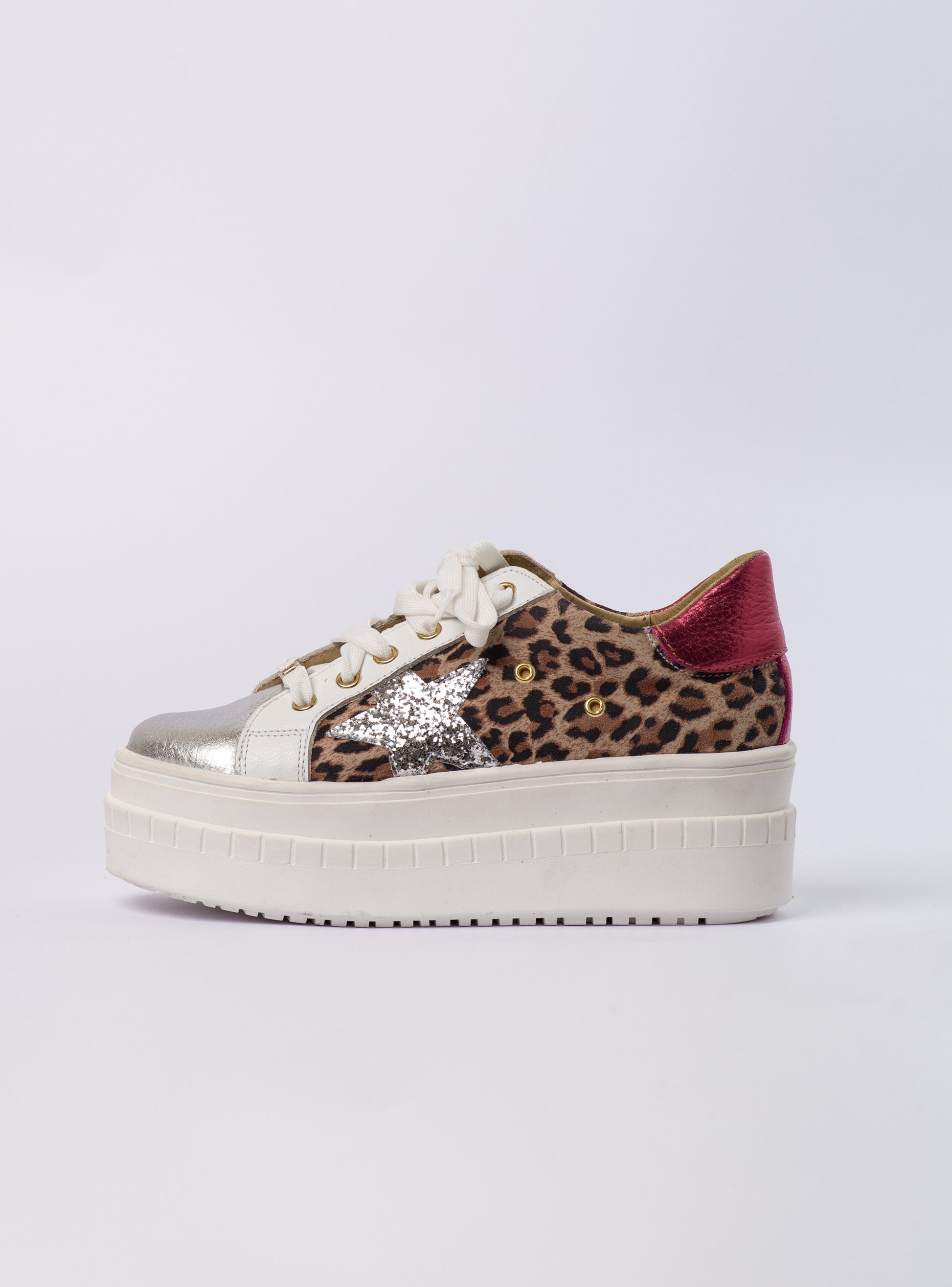 La Zapatilla Bimba Fucsia Print combina la fuerza del animal print con detalles en fucsia metalizado y plateado , logrando un diseño atrevido y lleno de estilo. Confeccionada en cuero genuino de primera calidad , garantiza y comodidad para el uso diario. Su plataforma blanca añade altura sin perder comodidad, mientras que la estrella con brillos plateados aporta un toque moderno y llamativo. Perfecta para quienes quieren destacar con un look urbano y único.