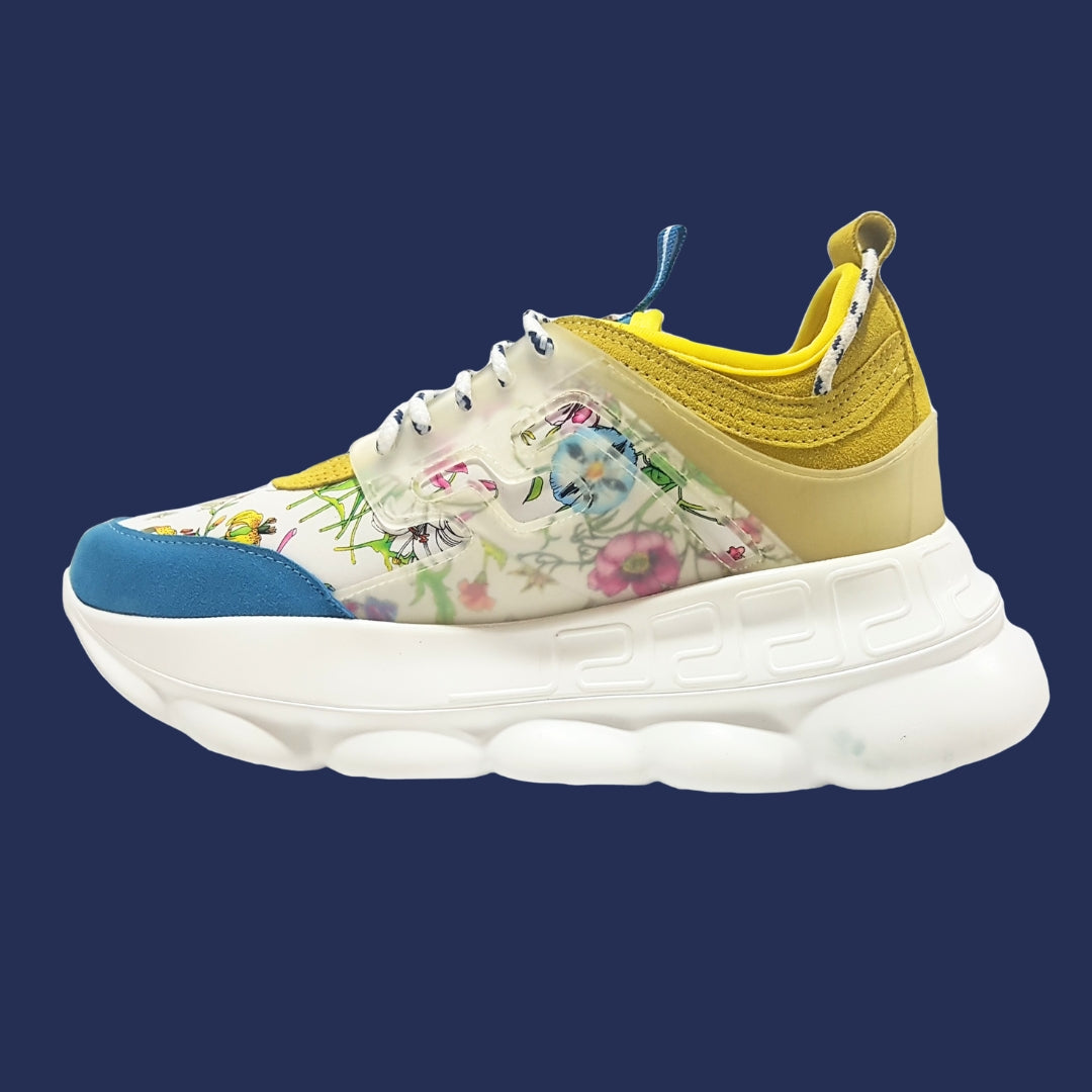 Color, energía y estilo se unen en la Zapatilla Blue Amarillo Floral , una zapatilla con estampado de flores y detalles en azul y mostaza. Su suela alta blanca ofrece la máxima comodidad, mientras que su diseño exclusivo la convierte en un imprescindible para esta temporada.
