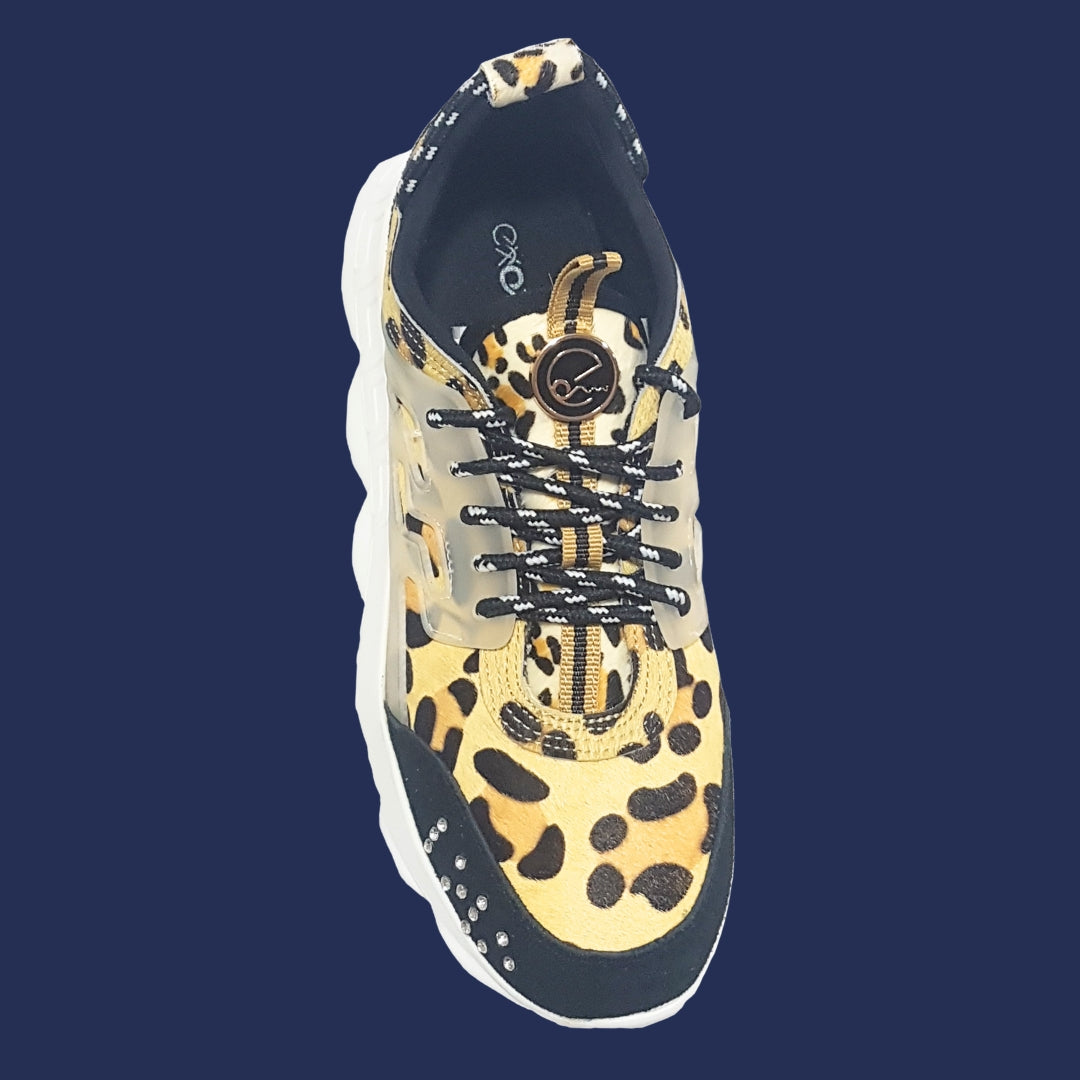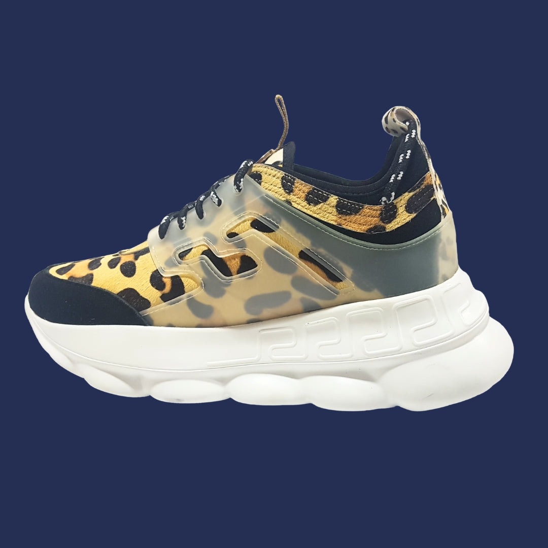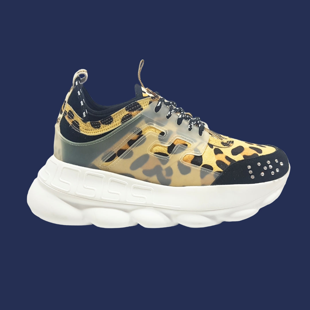 La Zapatilla Brown es pura actitud. Con su estampado animal print en tonos tierra, detalles translúcidos y una suela alta con diseño geométrico, combina comodidad y estilo para el día a día. Perfecta para looks urbanos con personalidad.