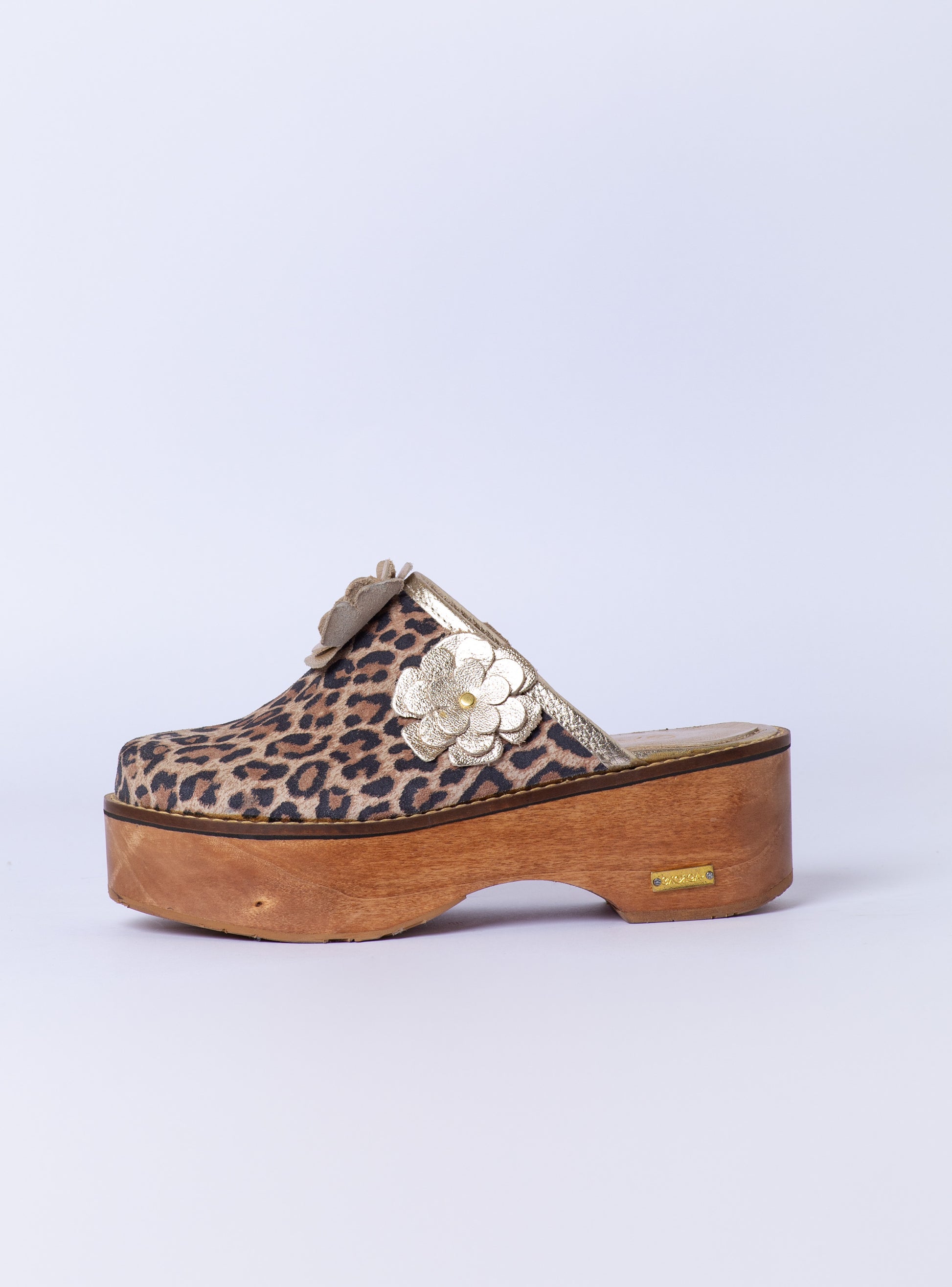 La sandalia zueco Dina combina el atractivo del animal print con detalles dorados que marcan la diferencia. Su plataforma de madera ofrece altura y estabilidad, mientras que las flores metálicas en relieve aportan un toque femenino y distintivo. Ideal para looks creativos y atrevidos que buscan destacar con estilo único. Colores disponibles: Animal Print con Dorado.