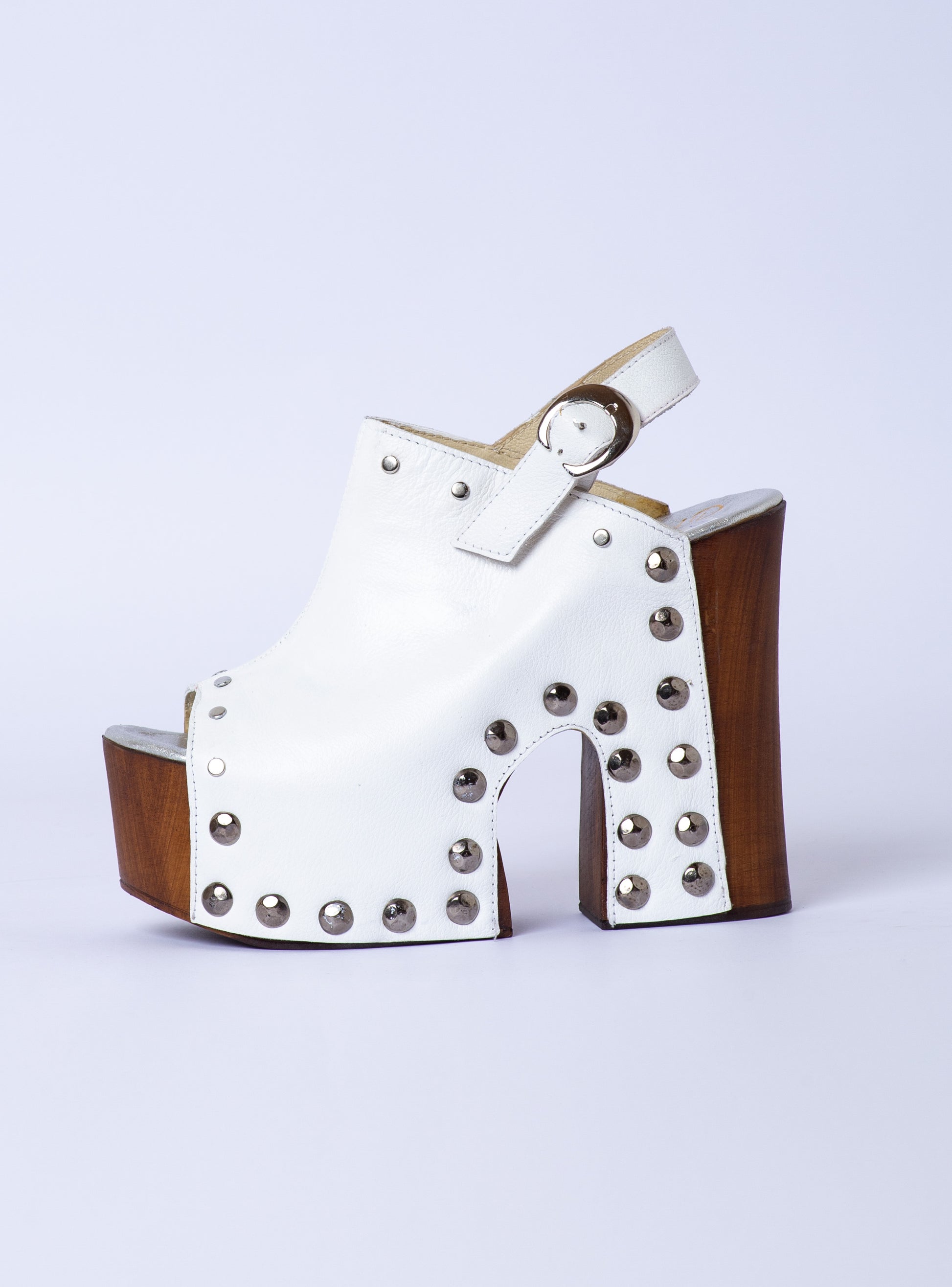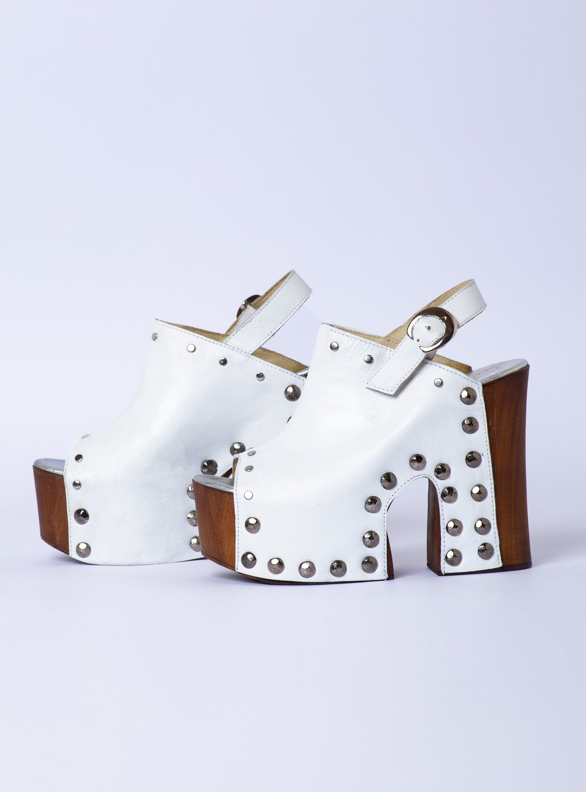Miranda es un zueco de plataforma con un estilo atrevido y único. Confeccionado en cuero blanco, se distingue por sus apliques metálicos en todo el contorno, que le dan un look rockero y cómodo. Su tacón y plataforma de madera aportan fuerza y personalidad, convirtiéndolo en el calzado ideal para quienes buscan destacar. Colores disponibles: Blanco.