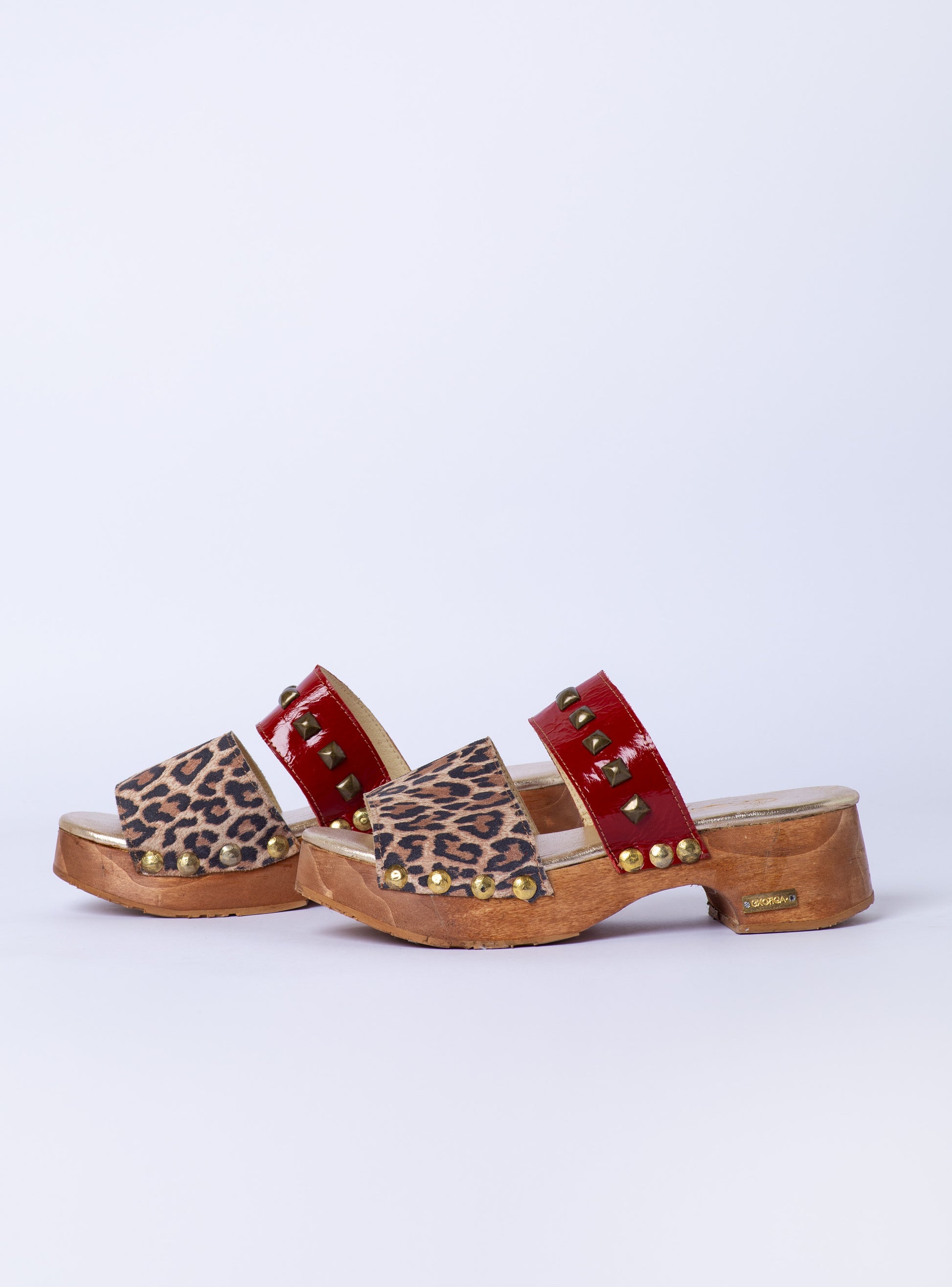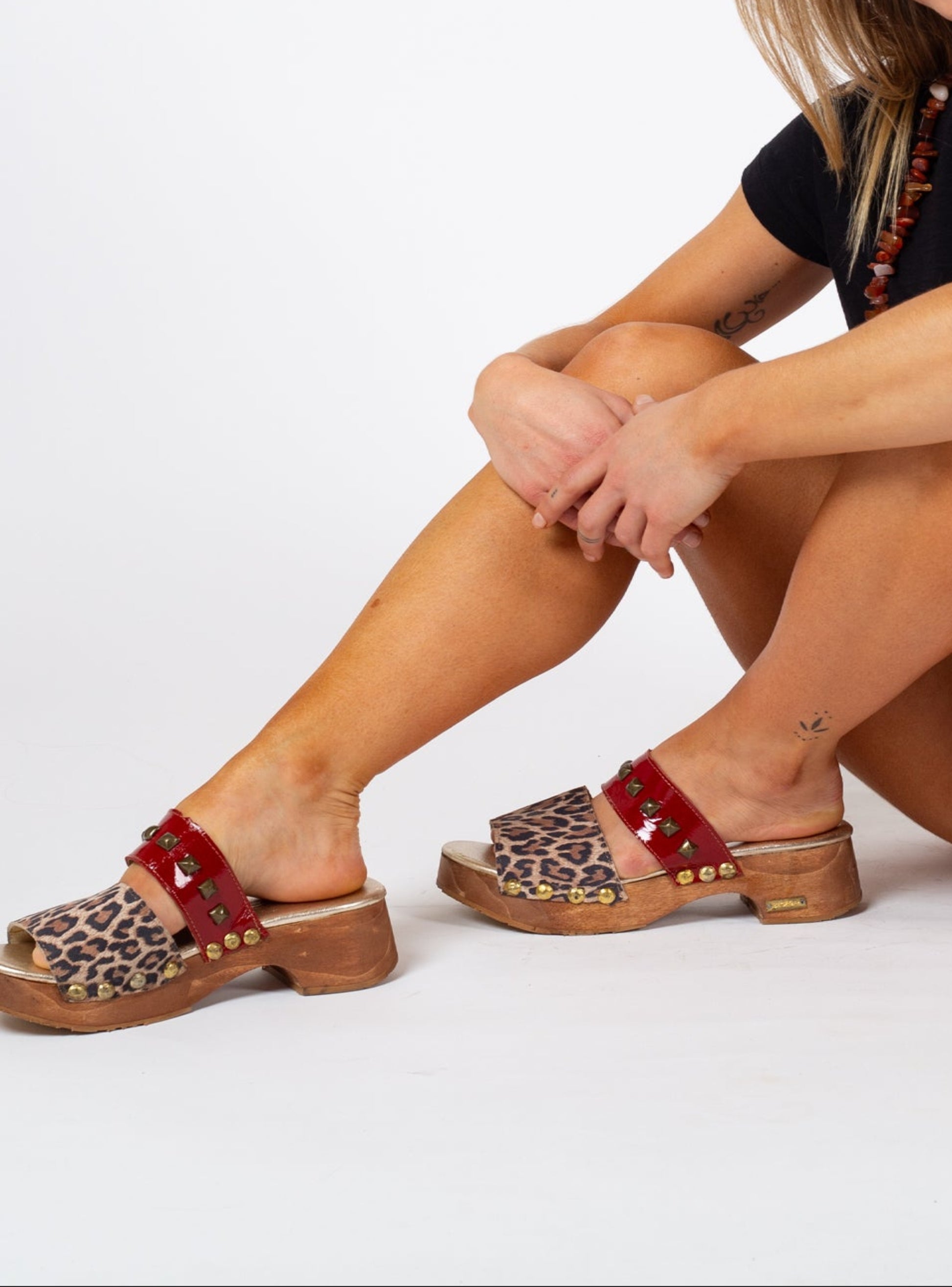 Atrévete a lucir única con esta sandalia zueco de madera, que combina el encanto del estampado leopardo con el toque vibrante del charol rojo . Su diseño de doble correa con tachas metálicas aporta fuerza y estilo, mientras que su planta anatómica asegura la máxima comodidad en cada paso. Ideal para looks urbanos, casuales o con un toque boho chic, esta sandalia es pura actitud y personalidad.